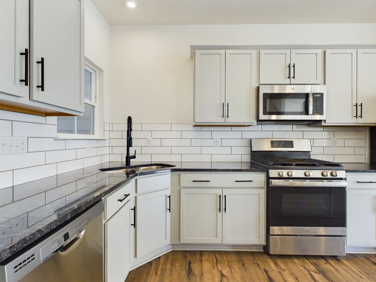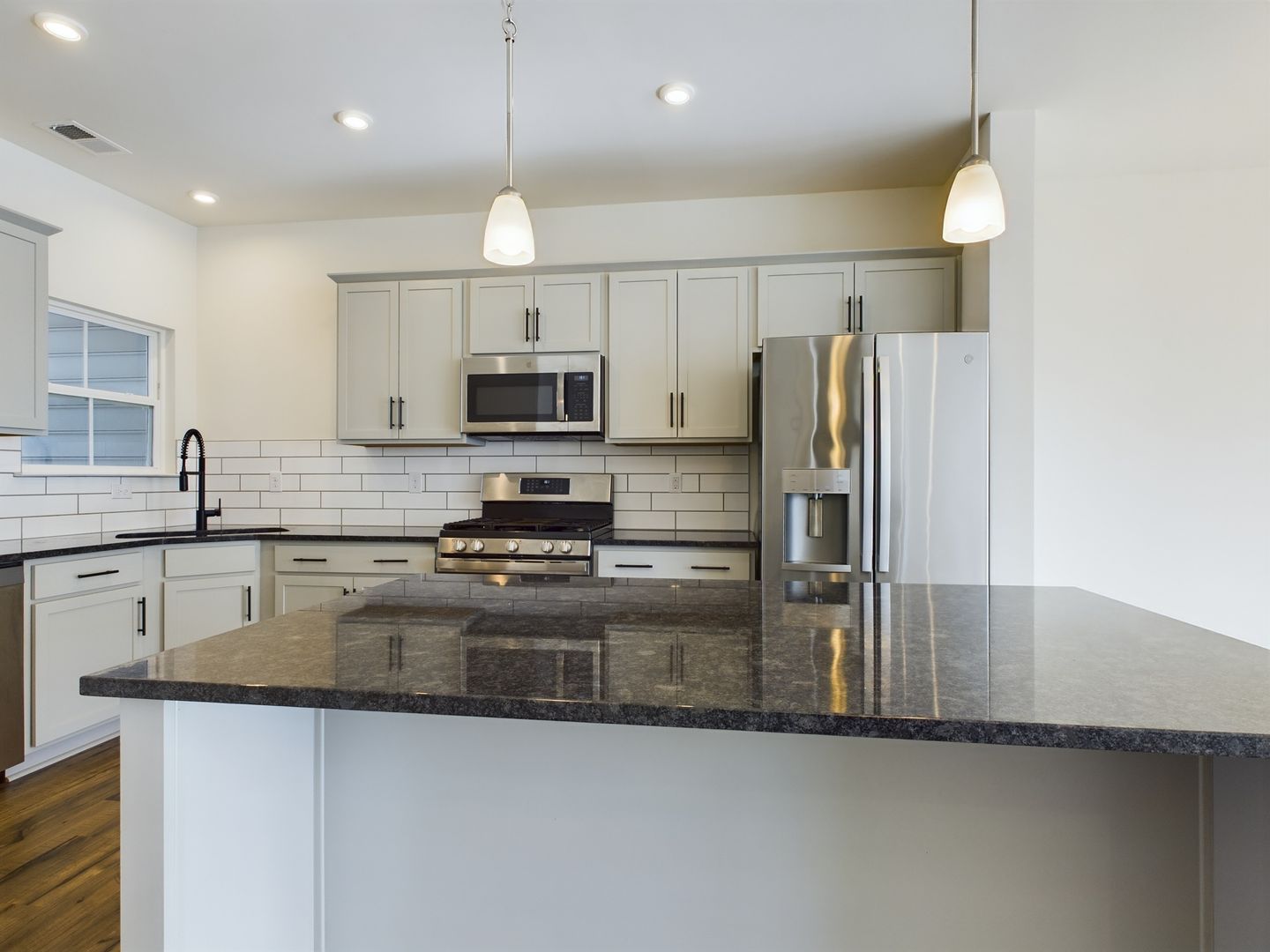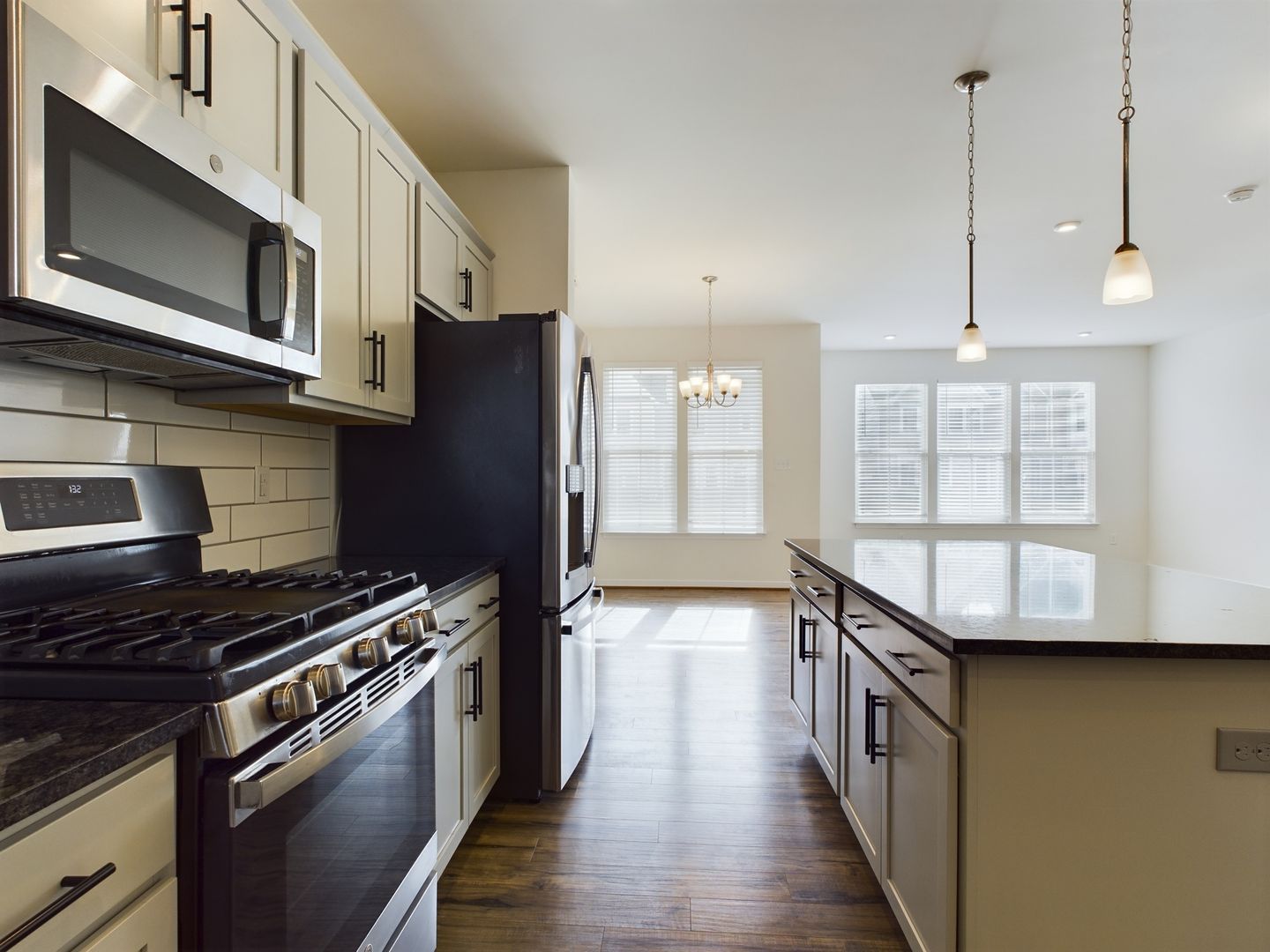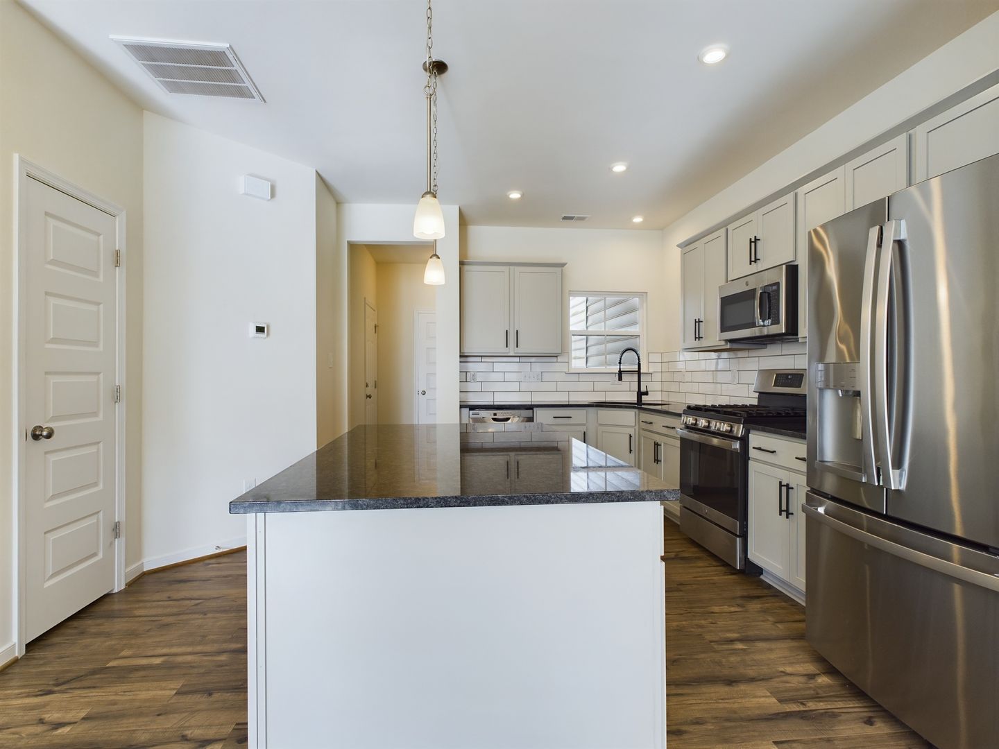 Step inside from the front door, rear entry or attached garage to plenty of natural light and luxury vinyl plank flooring throughout first floor. Open concept floorplan from the living room with gas fireplace flows to the dining area and kitchen completed with granite countertops, huge island, stainless steel appliances including gas range, tons of cabinet space, recessed lighting and more. Half bathroom off of the rear hallway.