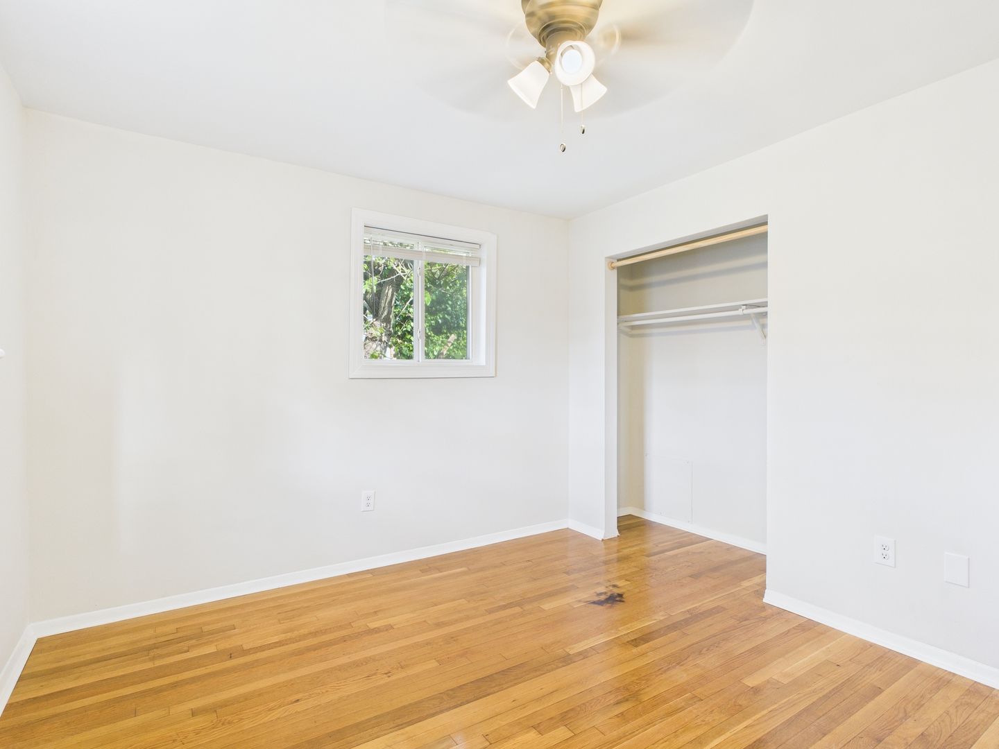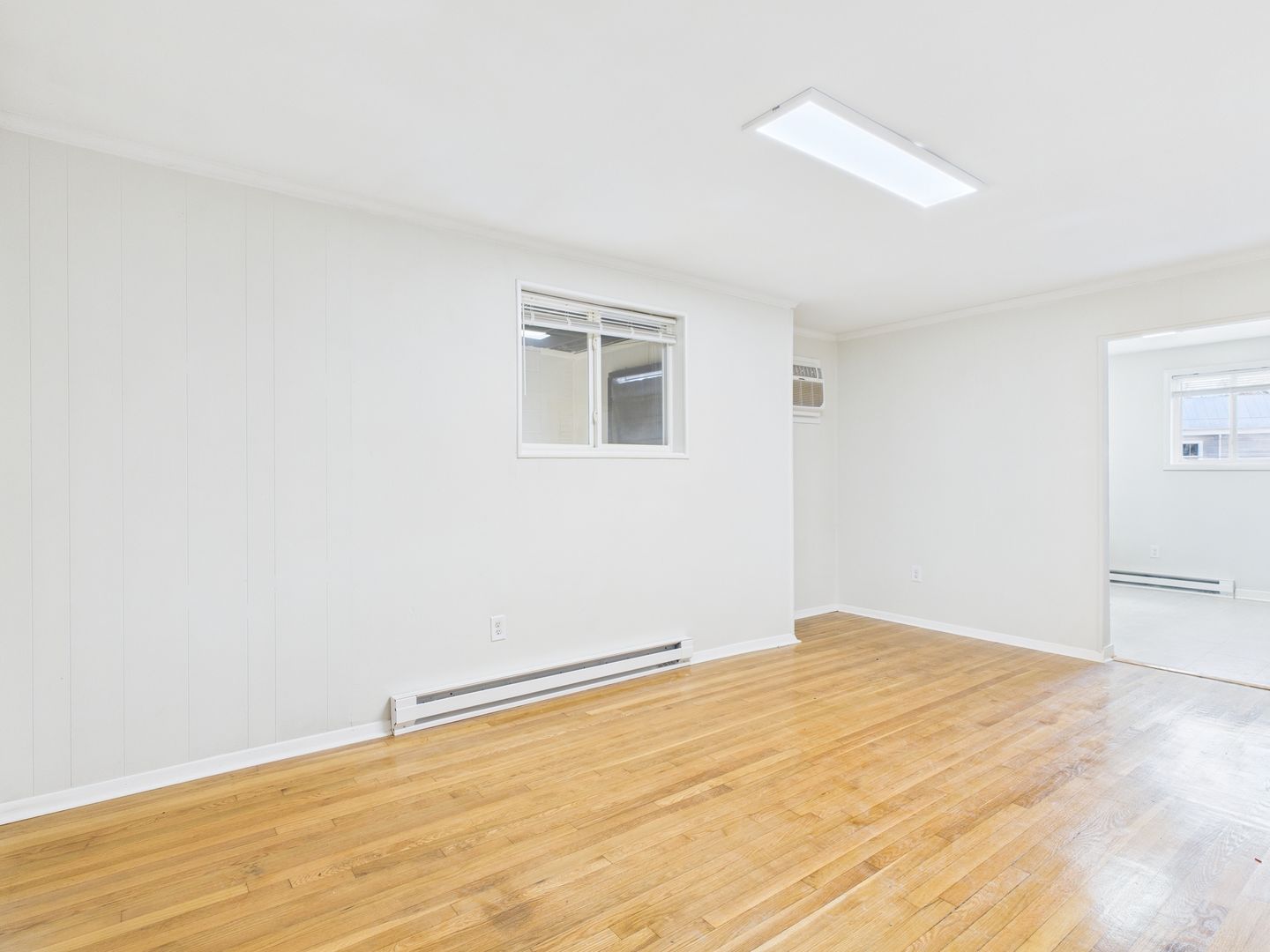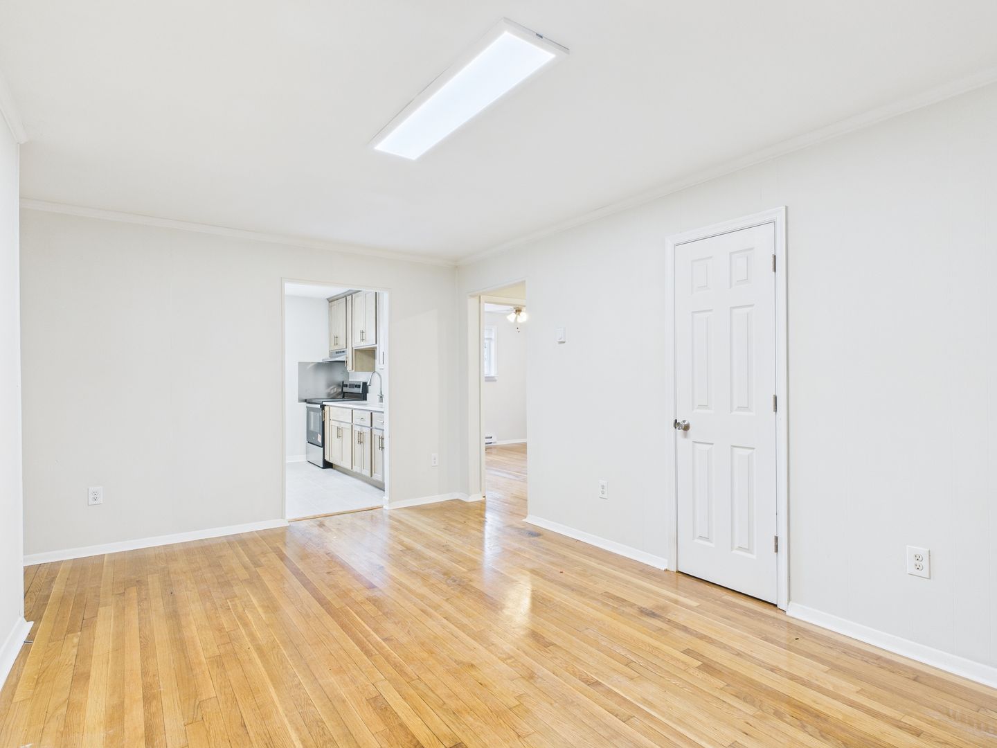 2 bedroom, 1 bath apartment, featuring hardwood floors and a modest kitchen with laminate flooring.