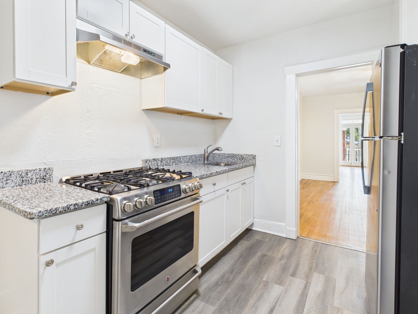 Recently renovated 2 bedroom, 1 bathroom apartment, featuring granite countertops, stainless appliances, new cabinets, refinished hardwood flooring in the living room and bedrooms, and luxury laminate in the kitchen and bathroom. Paid laundry in the basement.