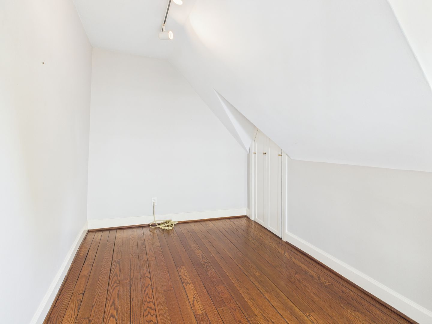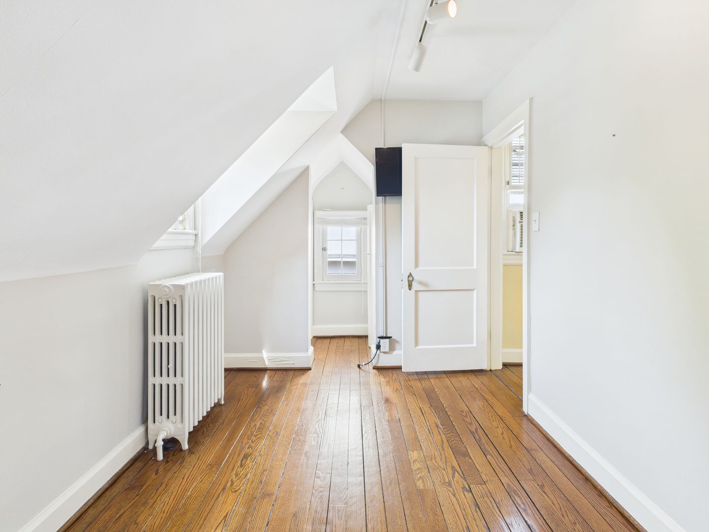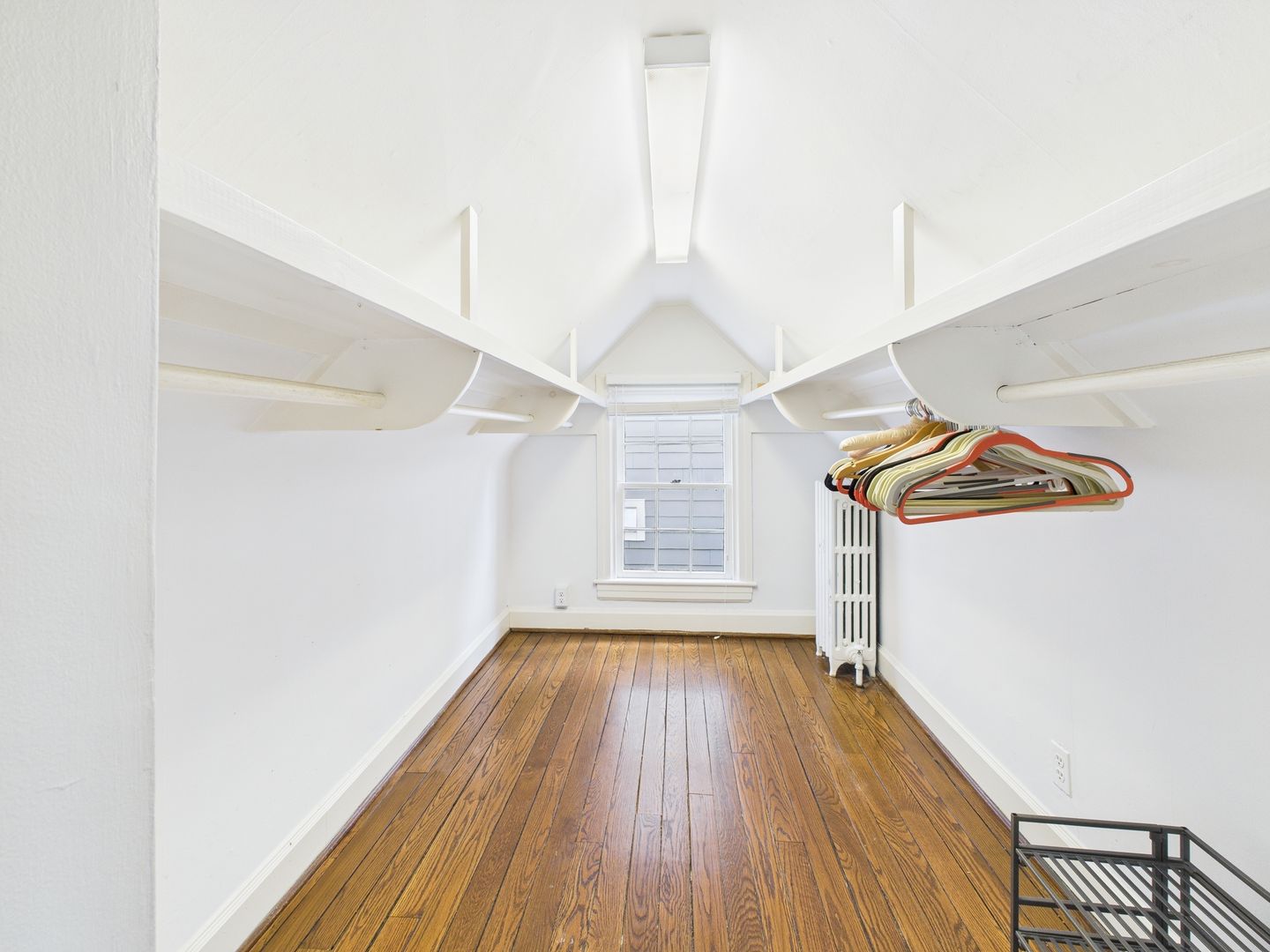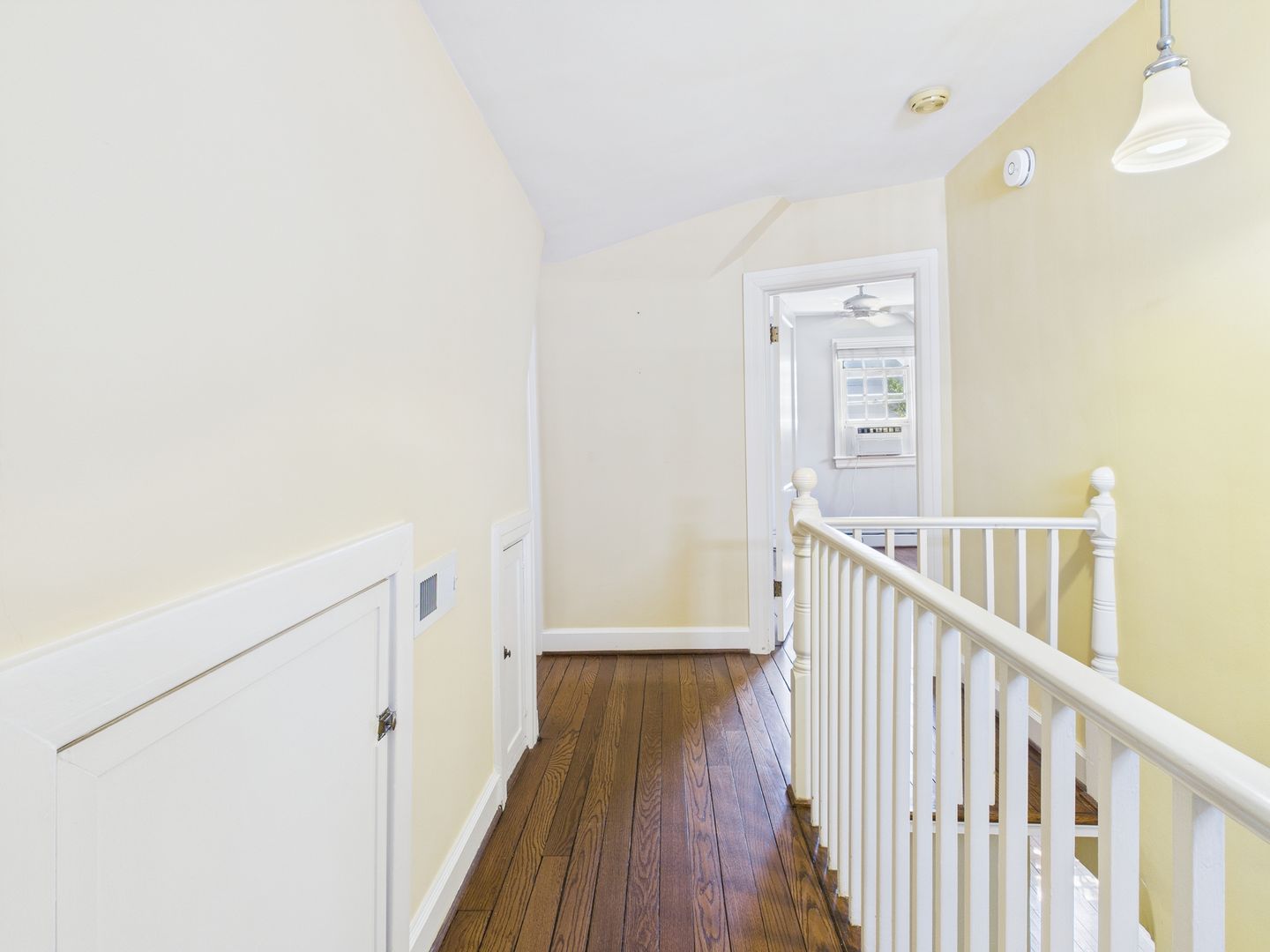 Head upstairs to two additional bedrooms, with a cozy one on the left that would be perfect for a nursery or child and large one on the right with a walk-in closet space. Full hallway bathroom with tiled floors and shower/tub combo along several storage closets complete this level.