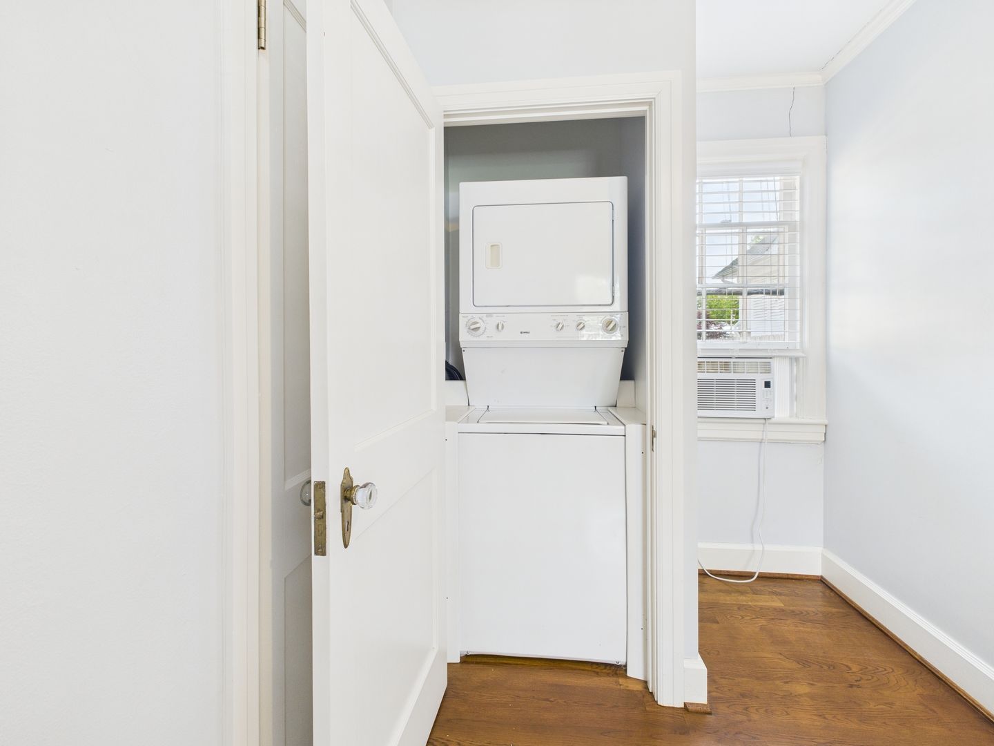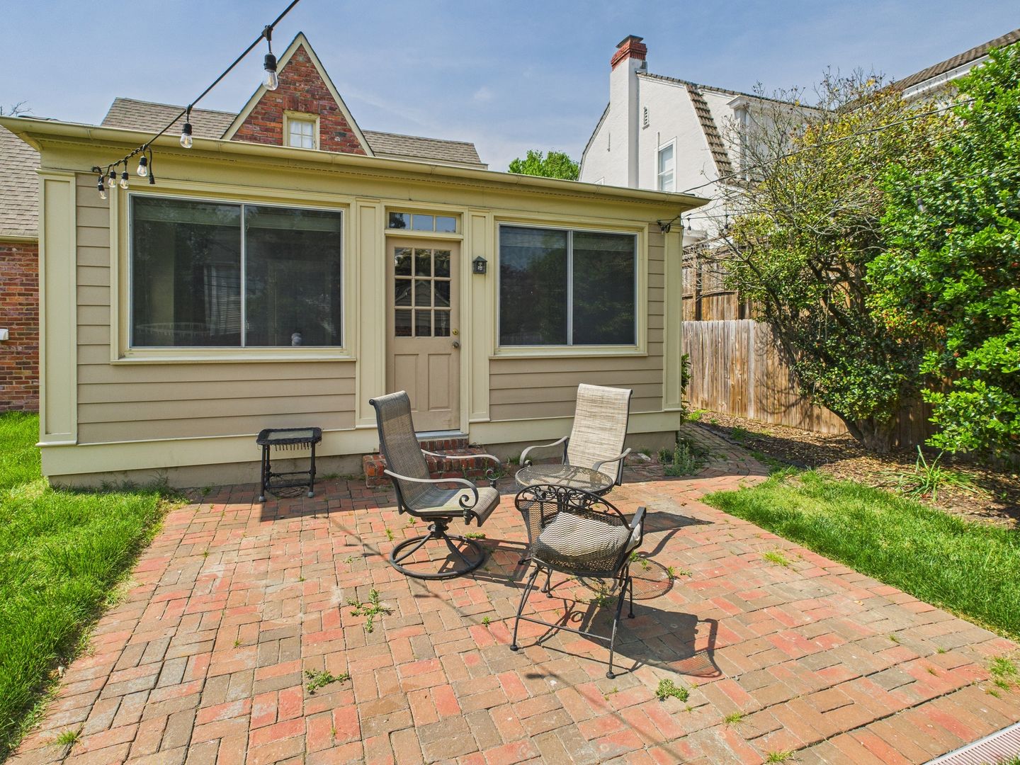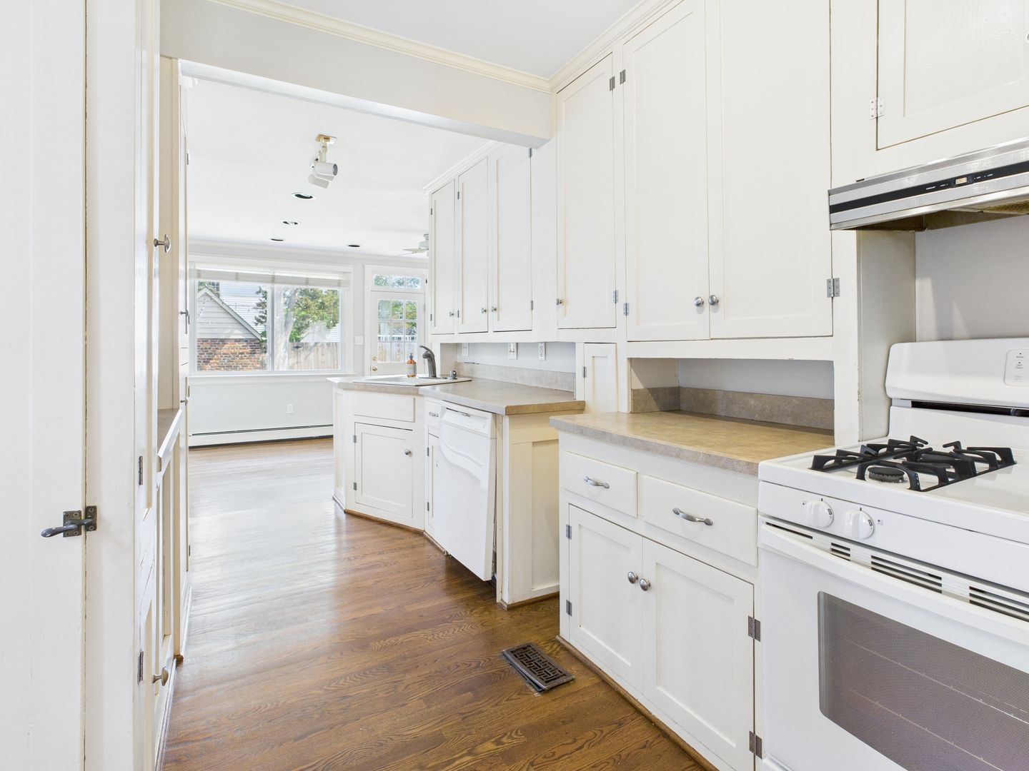 Step inside from the brick walkway through arched front entryway to plenty of natural light and hardwood floors flowing from the living room to the dining room. Galley style kitchen offers a gas range and tons of cabinet space. A spacious Family room connects off of the kitchen with built-ins for extra storage. Back down the hallway from the Living room is a nice sized bedroom at the end with ample closet space as well as laundry closet with stackable washer and dryer to convey. Another bright room is a flex space that could be used as a bedroom, office or play room. Full hallway bathroom with tiled floors and shower/tub combo.