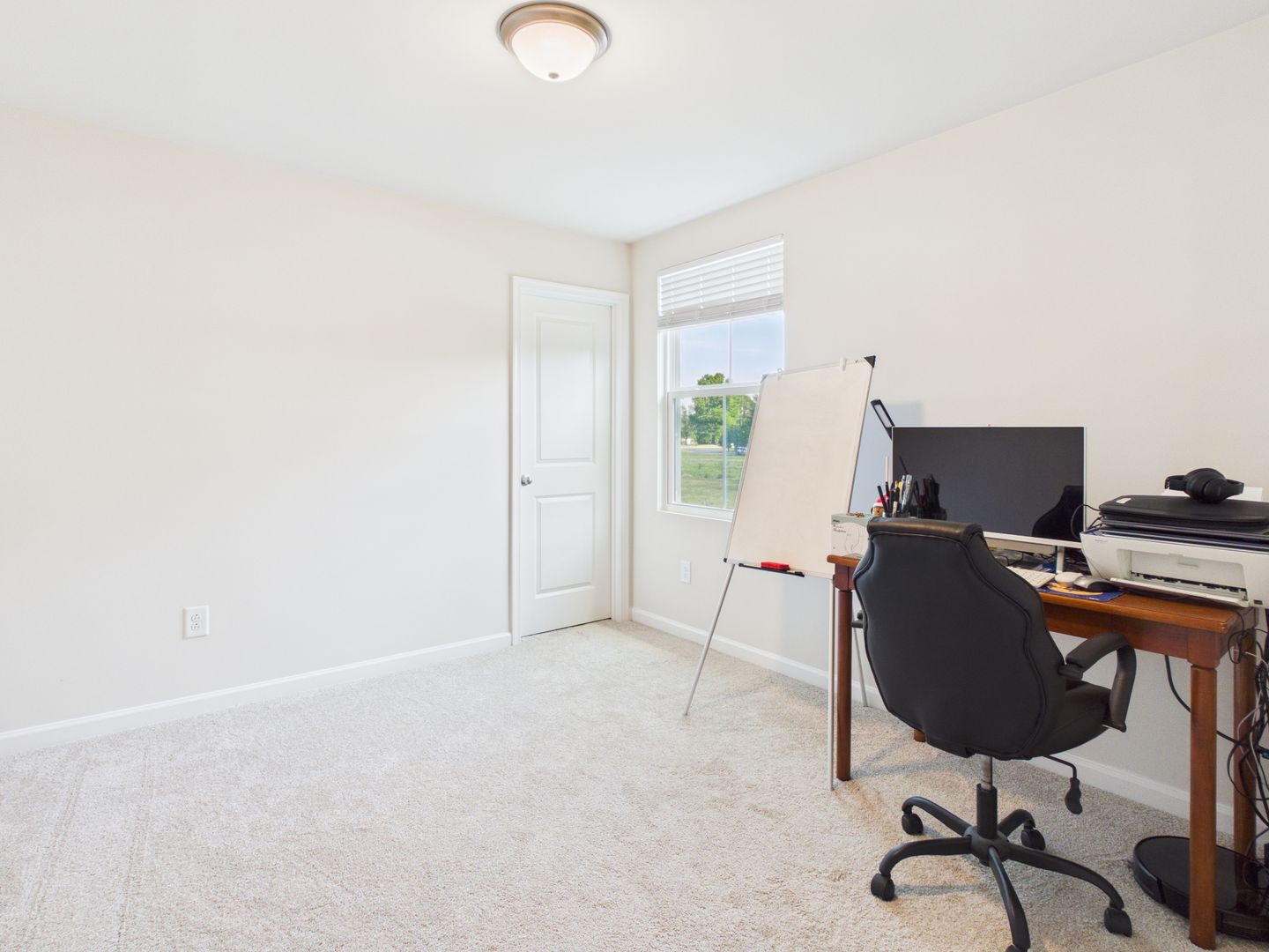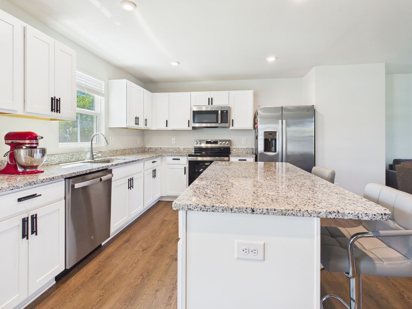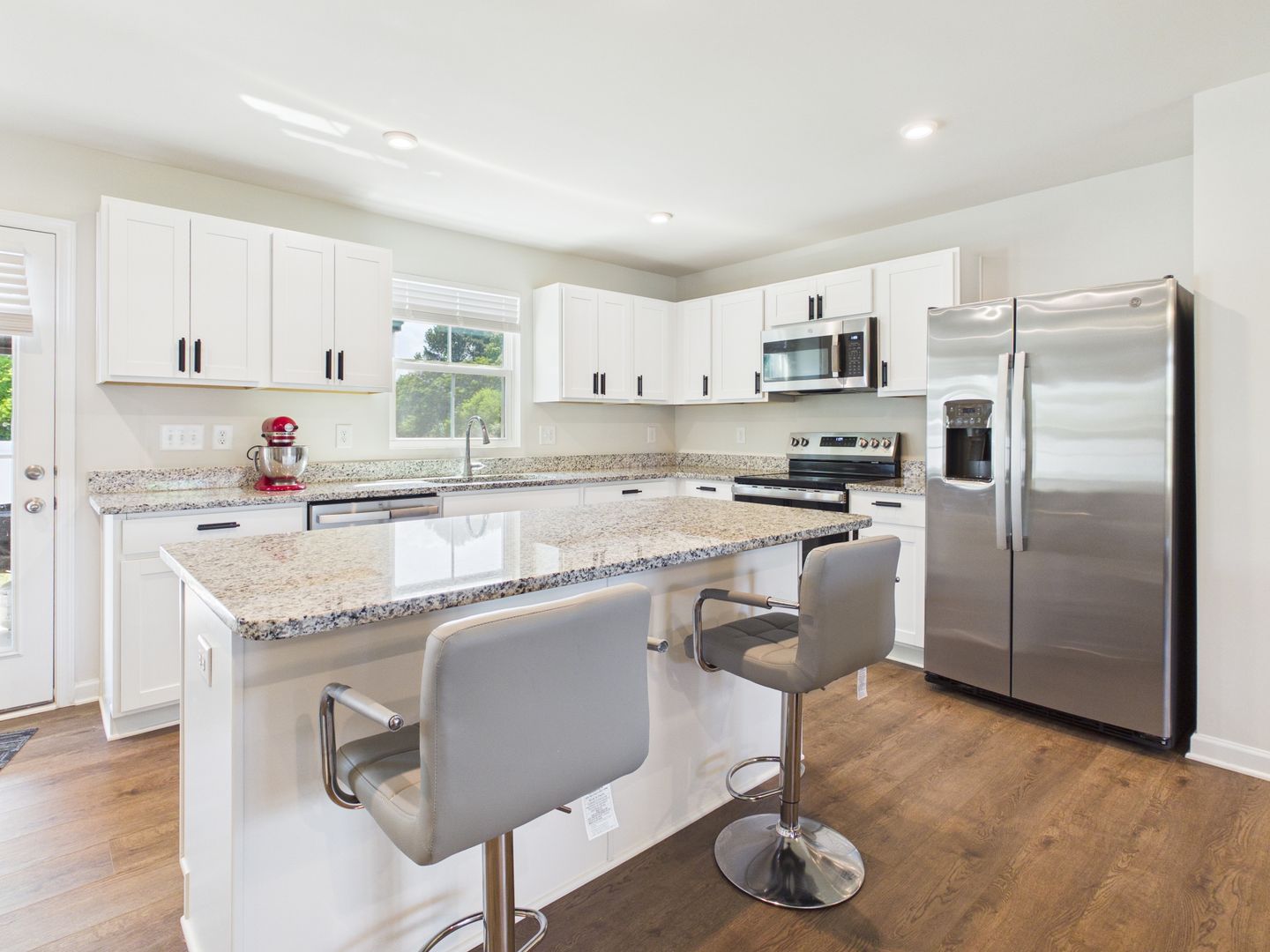 The main level features a bright, airy layout with seamless flow between the living, dining, and kitchen areas. The kitchen is appointed with stainless steel appliances, custom cabinetry, and a central island, perfect for both everyday meals and entertaining. Down the hall is a half bath, entry to the 2-car garage, plus a bonus room, perfect for an office.