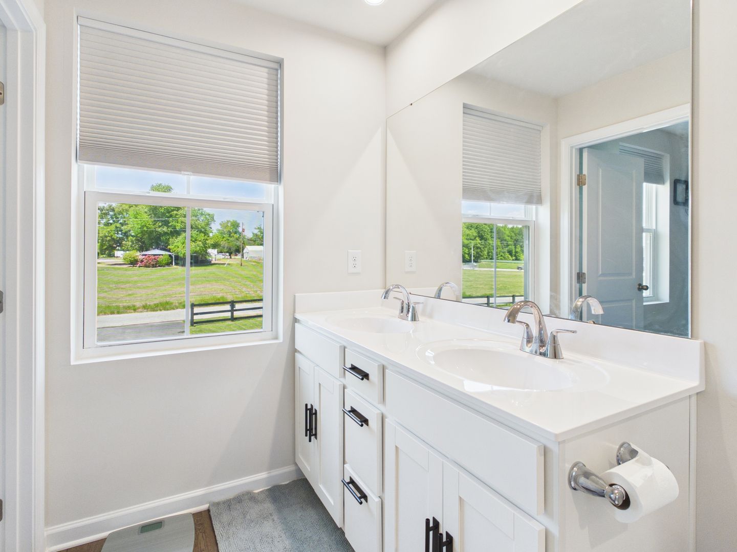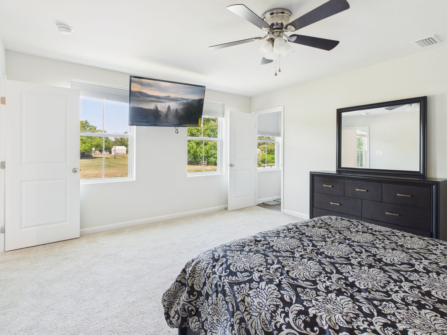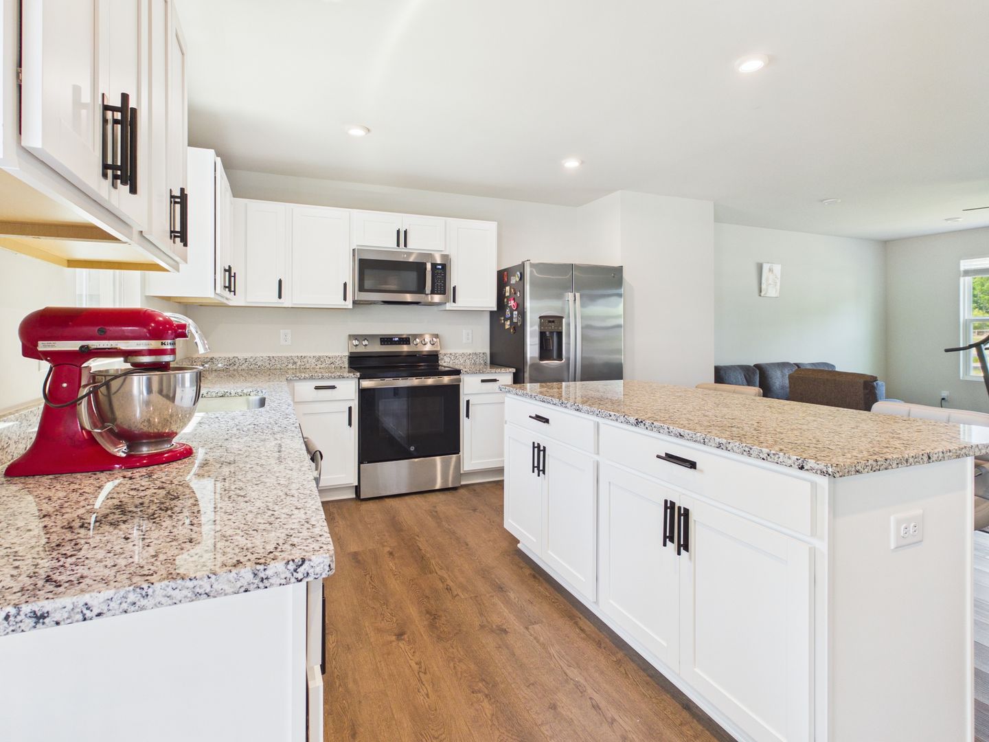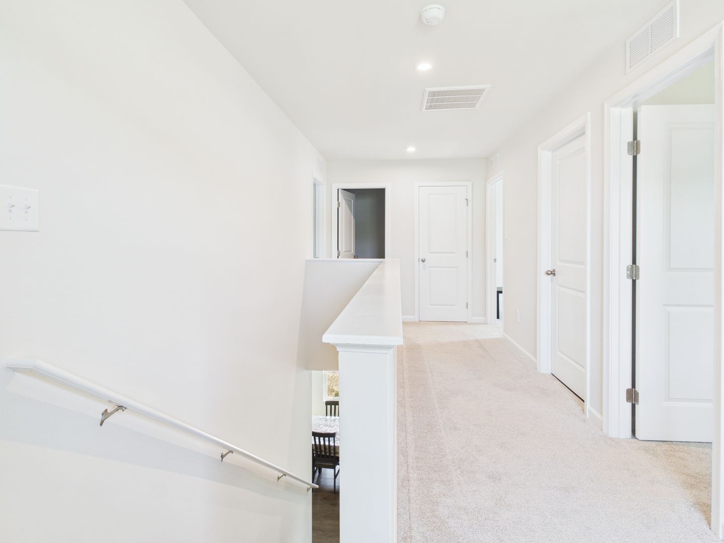 The main level features a bright, airy layout with seamless flow between the living, dining, and kitchen areas. The kitchen is appointed with stainless steel appliances, custom cabinetry, and a central island, perfect for both everyday meals and entertaining. Down the hall is a half bath, entry to the 2-car garage, plus a bonus room, perfect for an office.