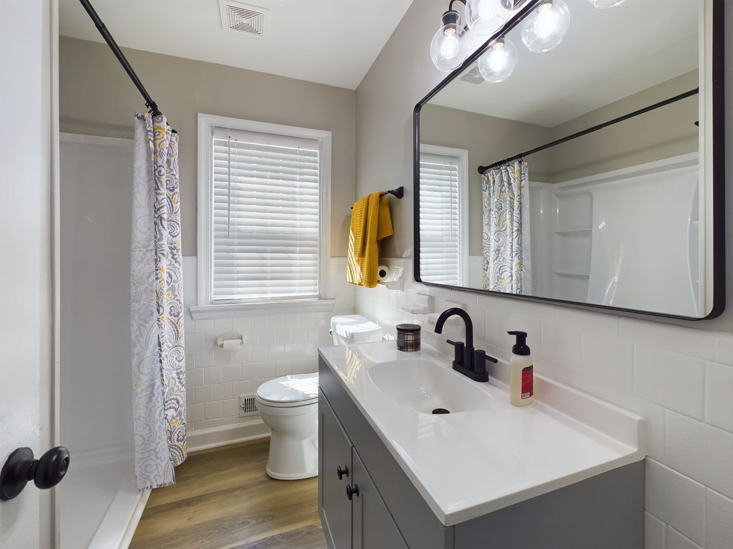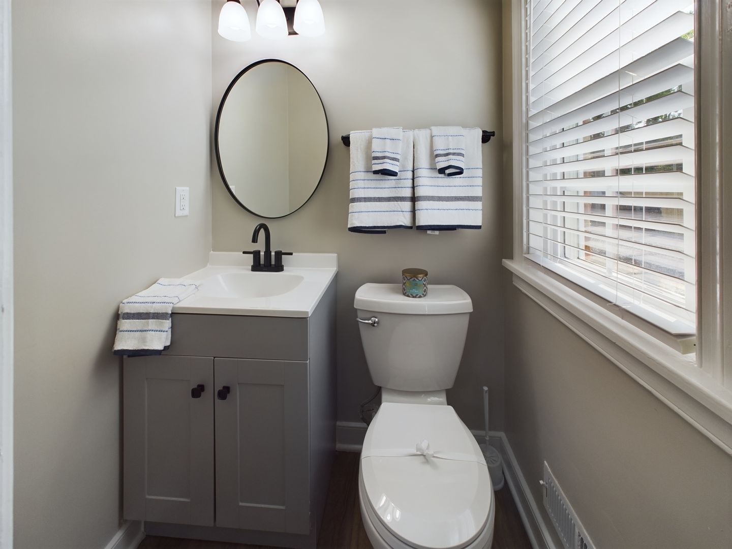 The home has BRAND NEW light fixtures throughout. All three bedrooms feature overhead lighting, generous closets, and lots of natural light. Moving through the hallway you will pass the full bath, which along with the half bath are TOTALLY RENOVATED with BRAND NEW shower, vanities, contemporary mirrors, and LVP flooring.