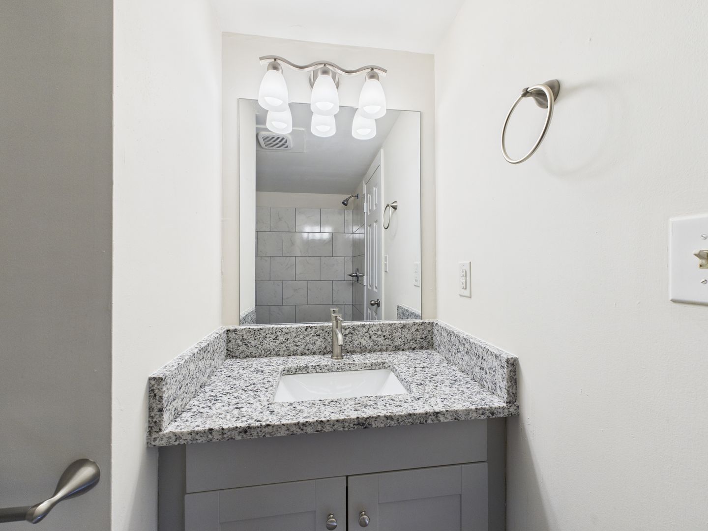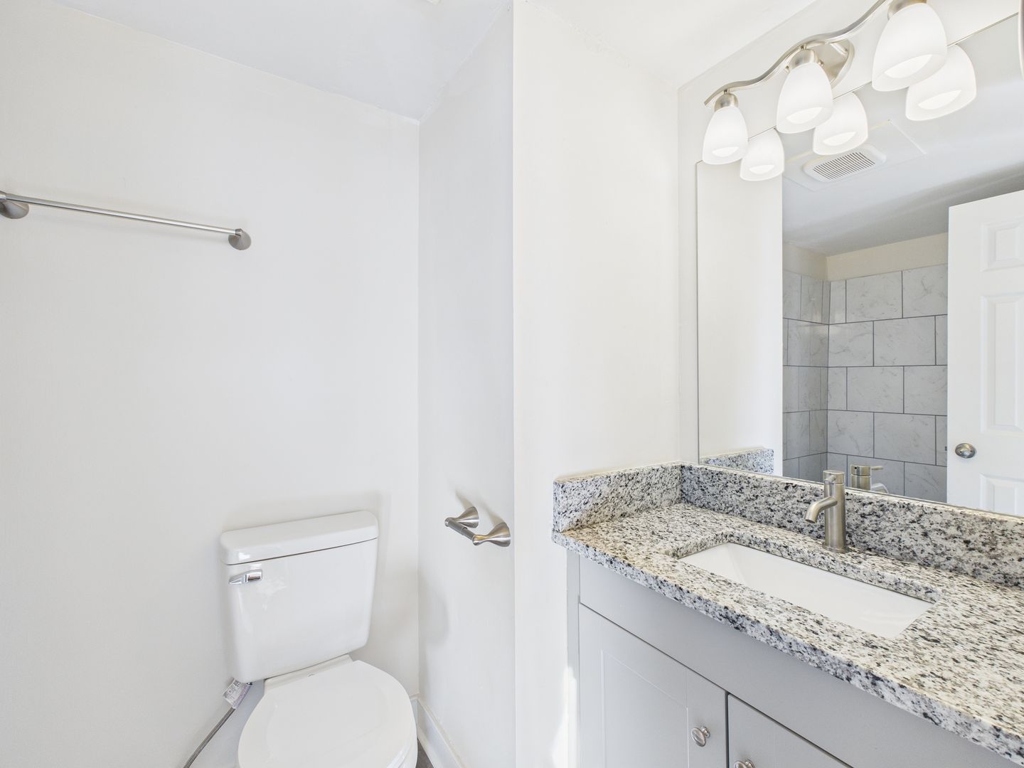 The bathroom offers a contemporary touch with a granite countertop vanity, brushed nickel fixtures, and ample cabinet storage. A large mirror and modern vanity lighting enhance the clean, bright aesthetic.