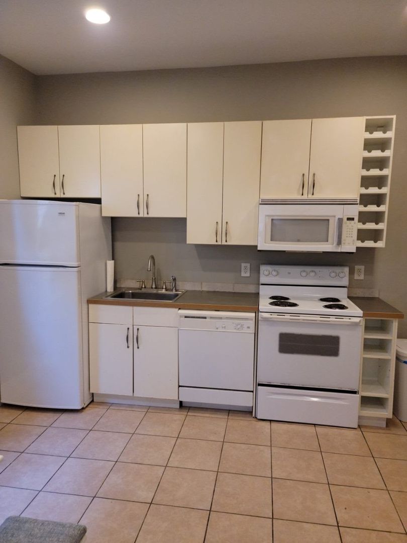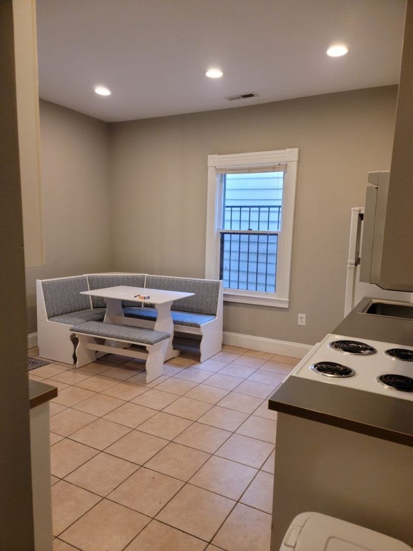 Down the hallway offers a large bedroom with ample closet space. Spacious eat-in kitchen complete with tile floors and plenty of cabinet space. Full bathroom at end of the hallway.