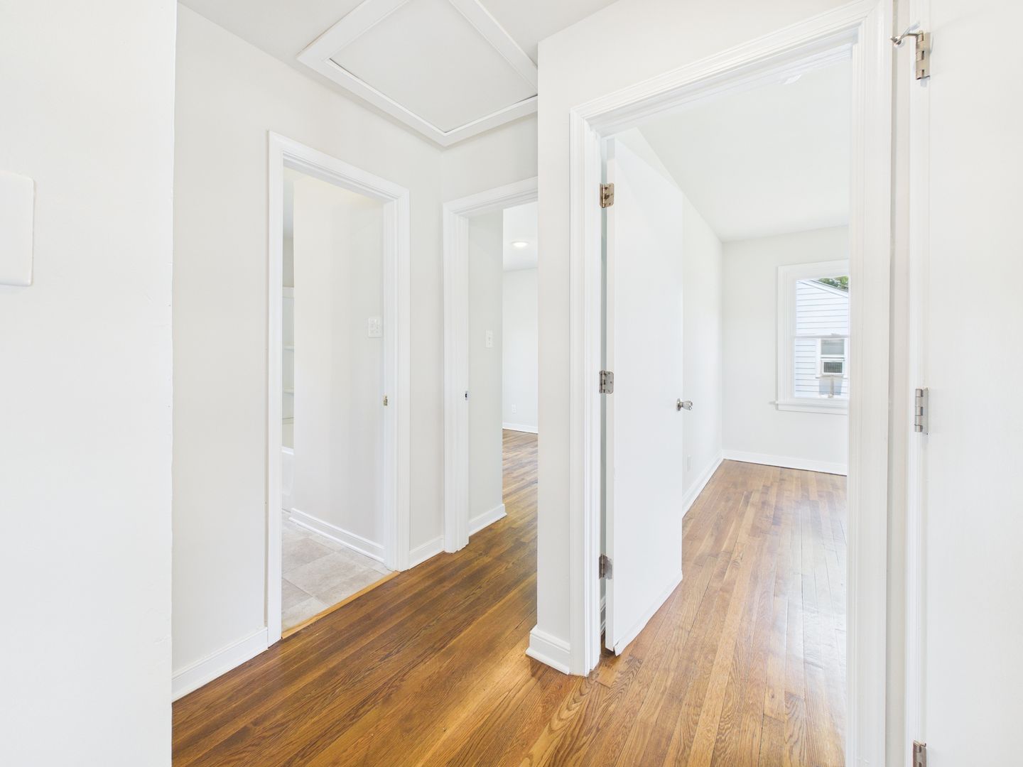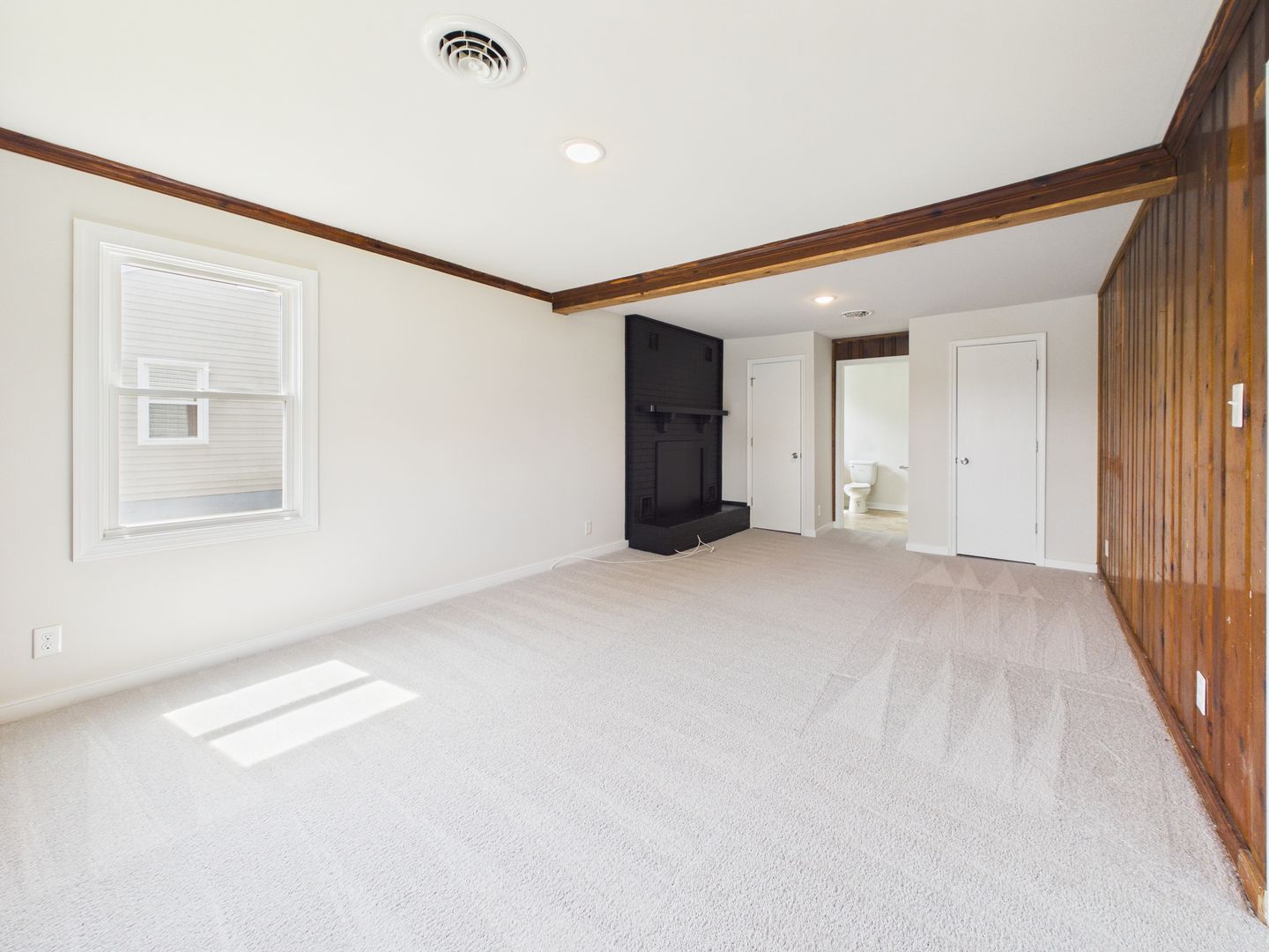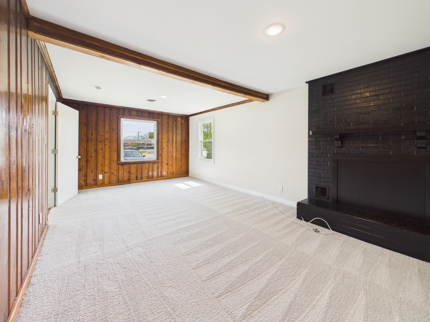 In the hallway, you’ll find three generously sized bedrooms, each with hardwood flooring and great natural light, along with a full shared bathroom. Tucked away on the opposite side of the home, the spacious primary suite offers added privacy and features brand new plush carpet, a decorative fireplace, charming wood paneling, and a large ensuite bathroom complete with a shower/tub combo.