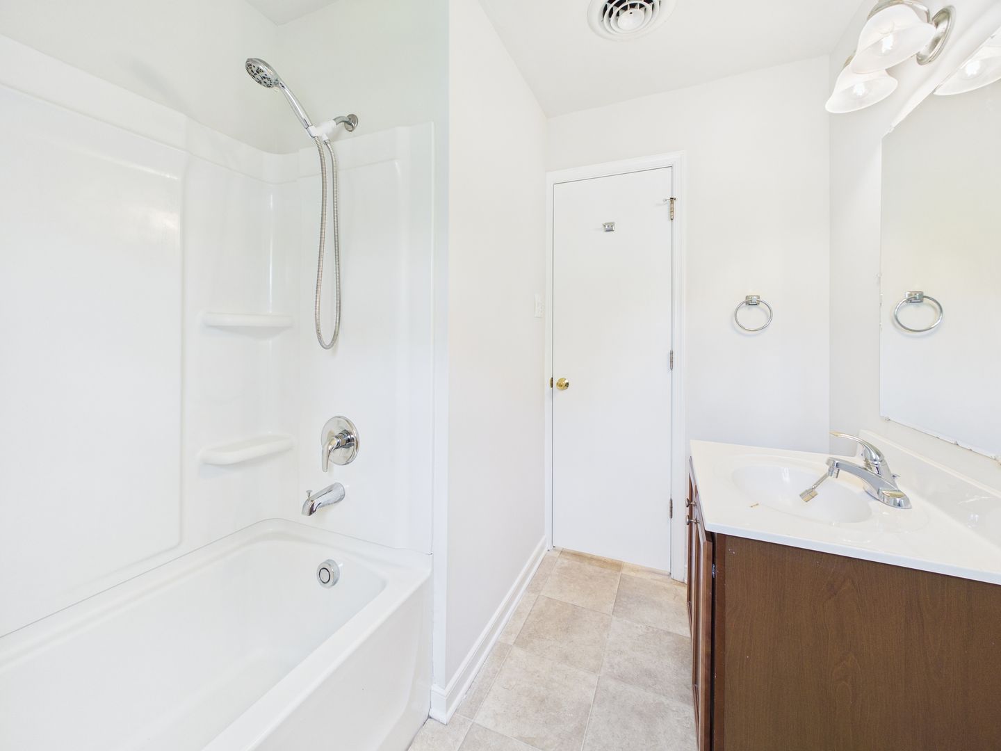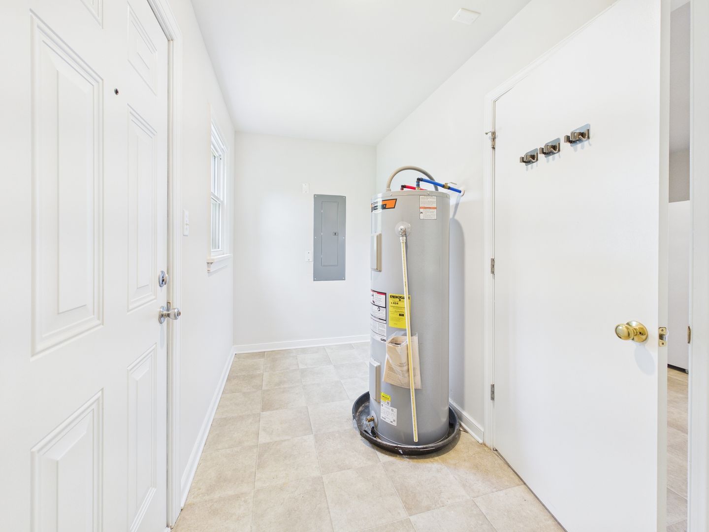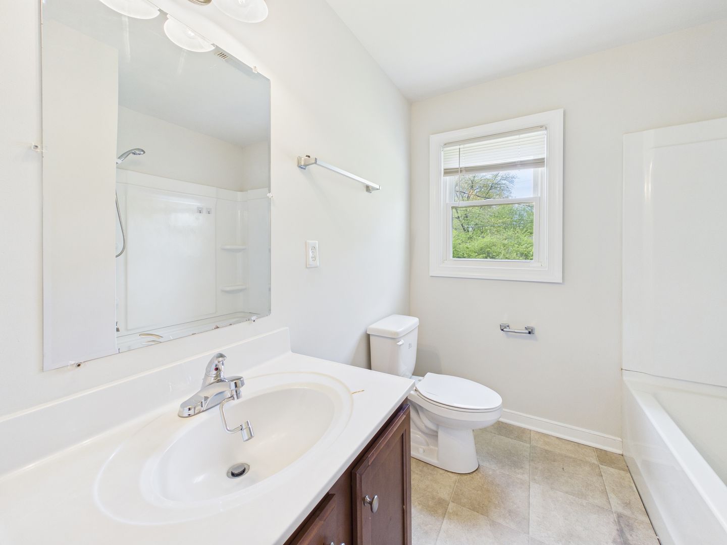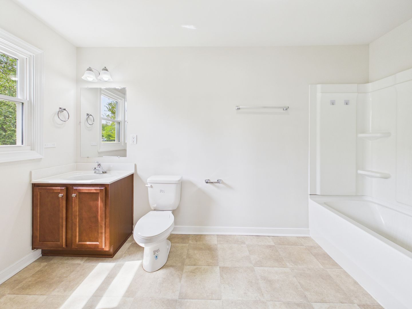 In the hallway, you’ll find three generously sized bedrooms, each with hardwood flooring and great natural light, along with a full shared bathroom. Tucked away on the opposite side of the home, the spacious primary suite offers added privacy and features brand new plush carpet, a decorative fireplace, charming wood paneling, and a large ensuite bathroom complete with a shower/tub combo.