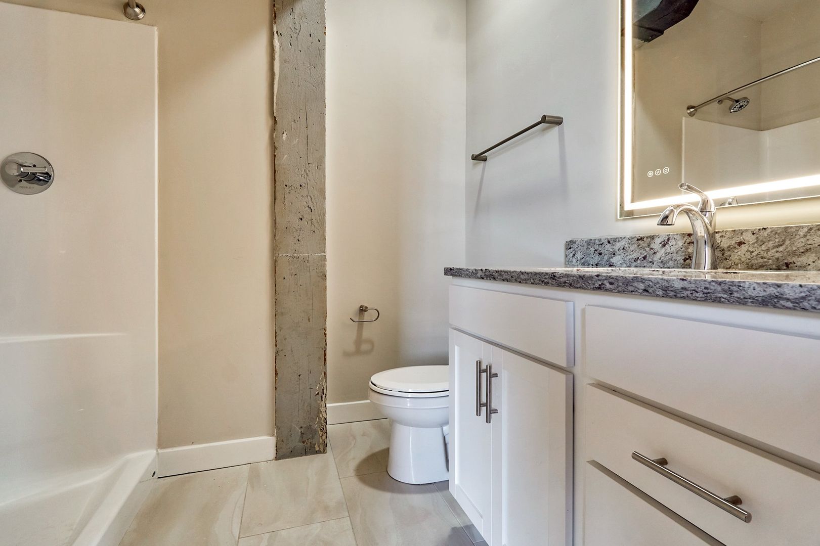 The spacious bedroom offers plenty of closet space and charming exposed brick. The full bathroom includes a granite vanity and a shower/tub combo. Washer and dryer are included.