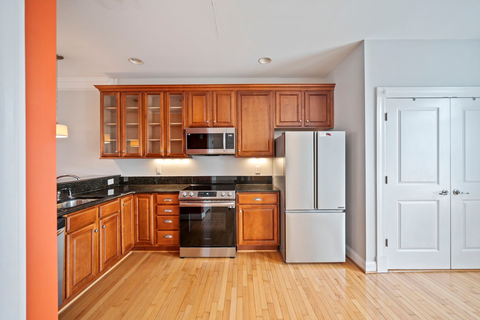 Step inside to great hardwood floors and wonderful natural light. First floor open concept living, dining and kitchen give ample room for any configuration! Stainless appliances and washer dryer to convey with lease. Half bath on the first floor as well. Head upstairs to three spacious bedrooms with ample closet space. Master bedroom with en-suite full bathroom, additional shared full bath in the hallway.