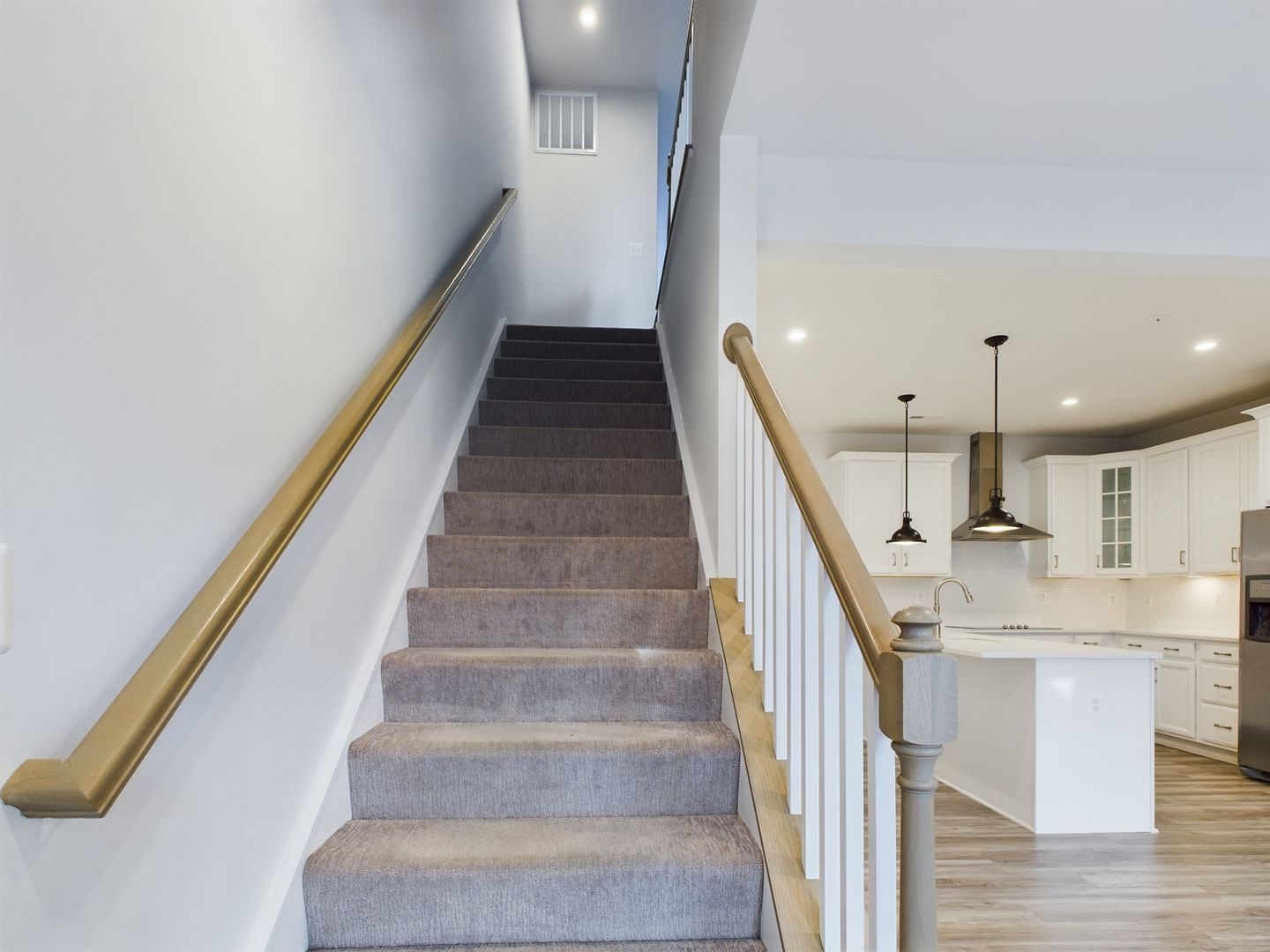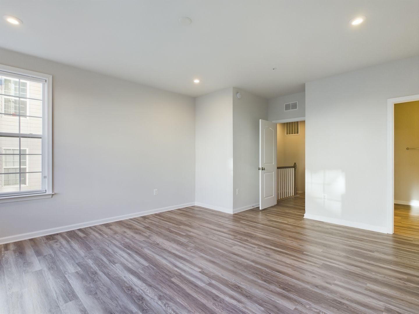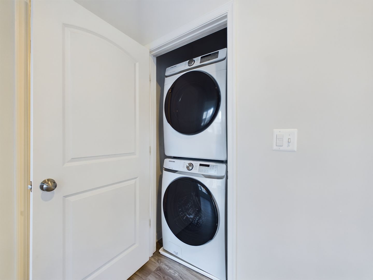 Head upstairs to the open landing area and luxury vinyl plank flooring throughout this level as well. Spacious Primary bedroom to the right with tons of natural light, double walk-in closets and en suite bathroom with double vanity and tiled walk-in shower. Back down the hallway offers the second bedroom with a large closet. Full hallway bathroom with tiled shower/tub combo. Laundry closet with stackable washer and dryer to convey. Bonus, bright flex room ideal for a home office, exercise spot, playroom or extra living space. Walk out balcony off of this room as well.