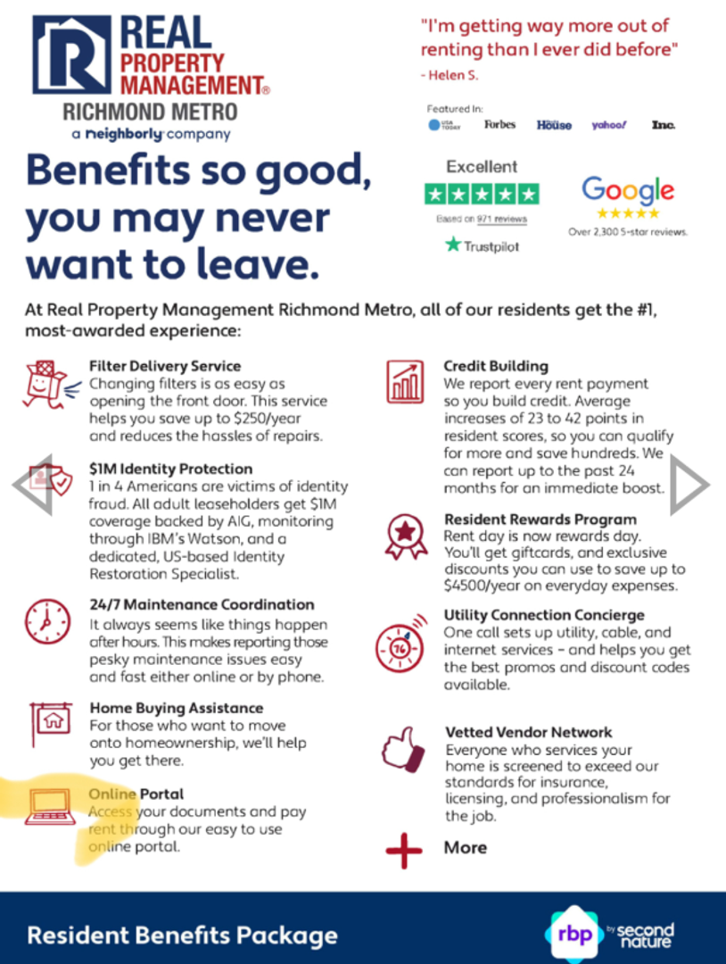 ***The Real Property Management Richmond Metro Resident Benefit Package is designed to provide convenience, professional services, and cost savings to our residents. By applying, Resident(s) agree to be automatically enrolled in the program and agrees to pay an additional $45 per month, payable with rent.