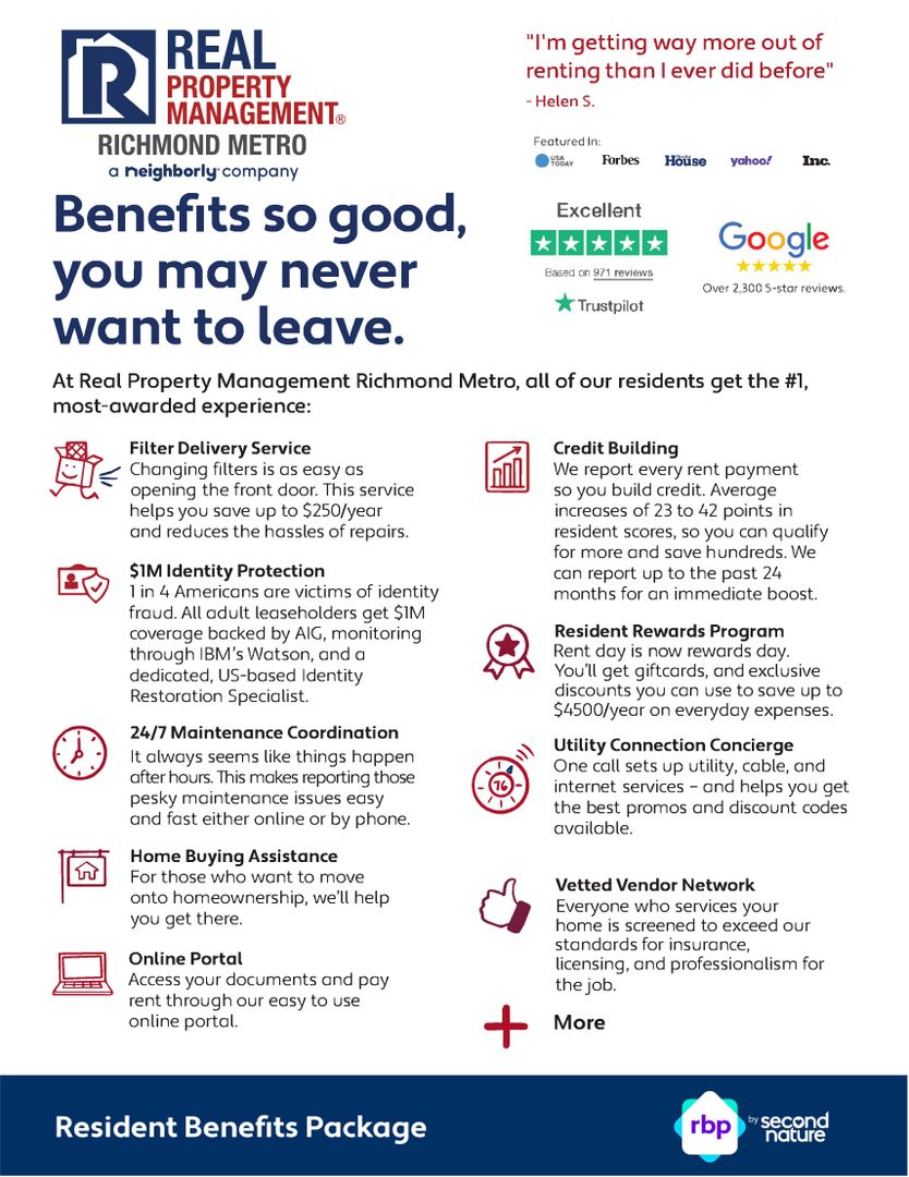 ***The Real Property Management Richmond Metro Resident Benefit Package is designed to provide convenience, professional services, and cost savings to our residents. By applying, Resident(s) agree to be automatically enrolled in the program and agrees to pay an additional $45 per month, payable with rent.