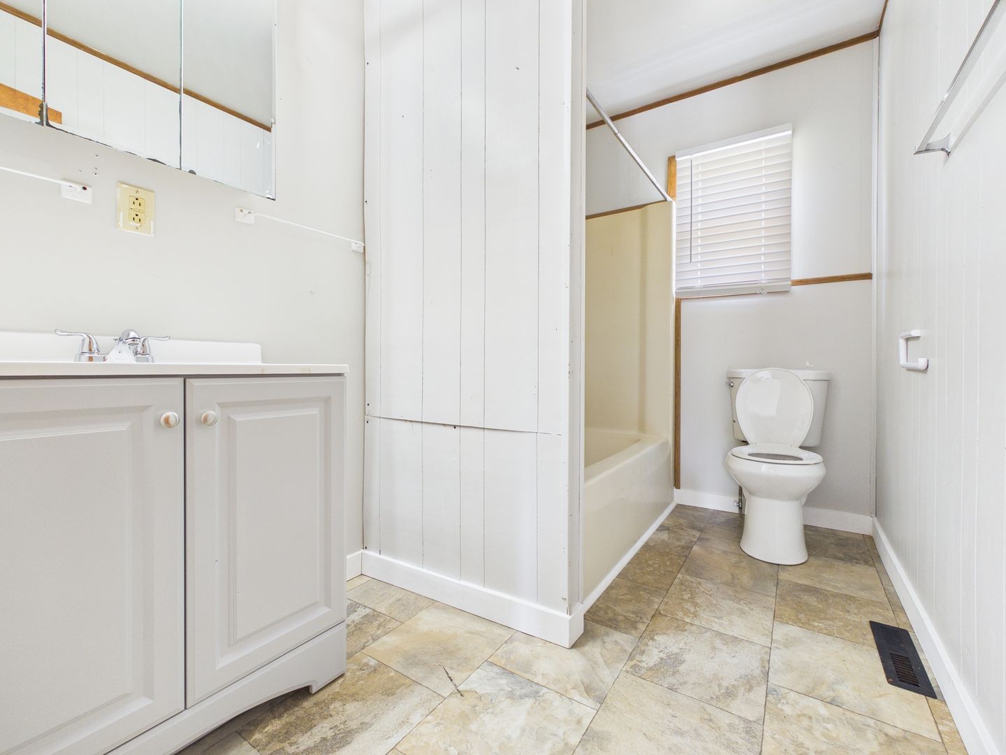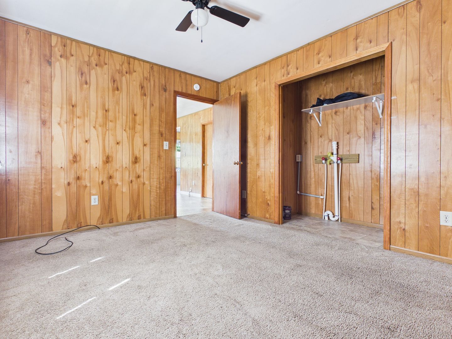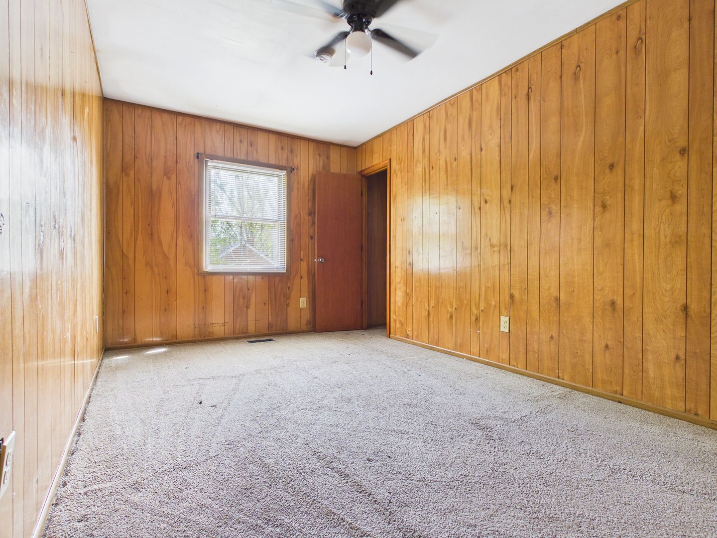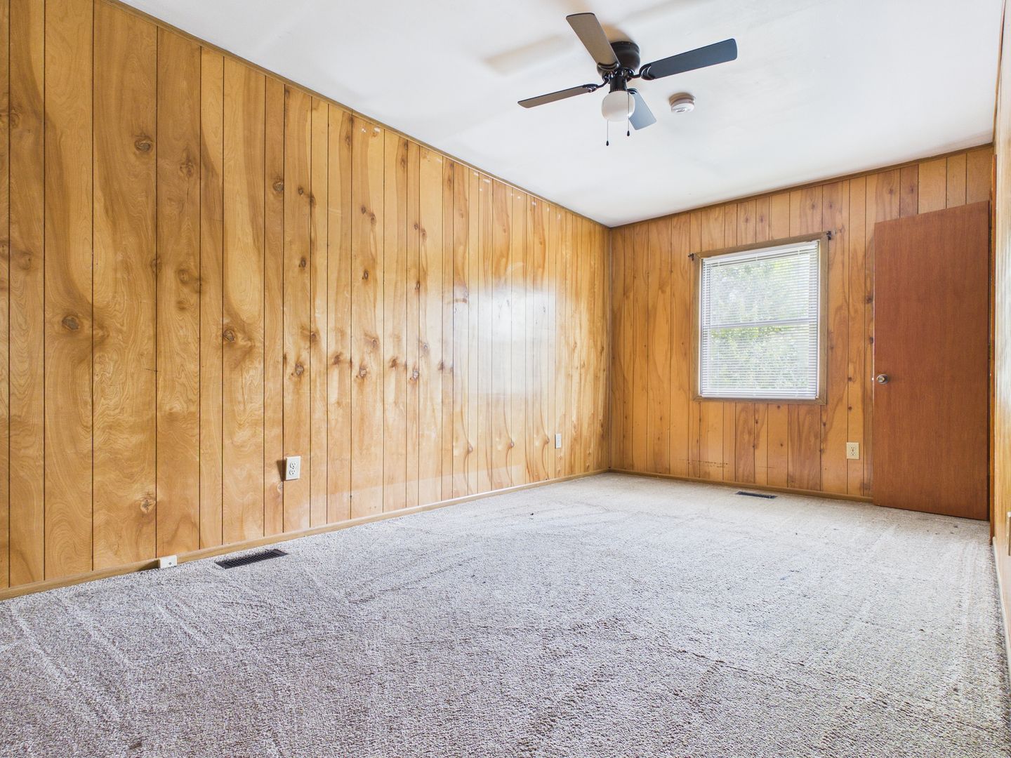 Step inside to a bright and inviting living space featuring warm wood-paneled walls and plenty of room to relax or entertain. The kitchen is equipped with a breakfast bar and ample cabinet space, making it both functional and convenient for everyday living.