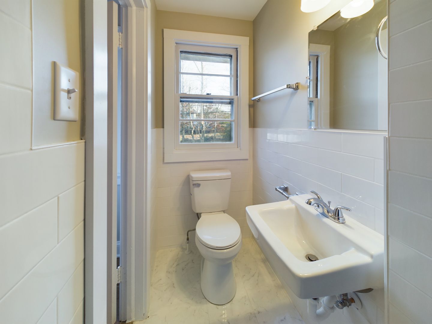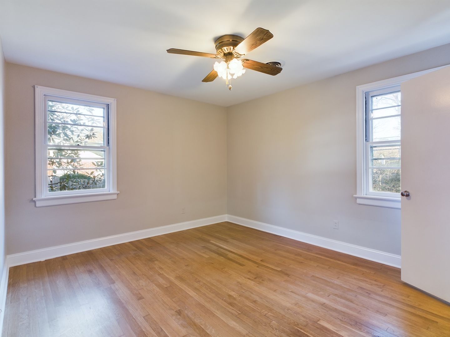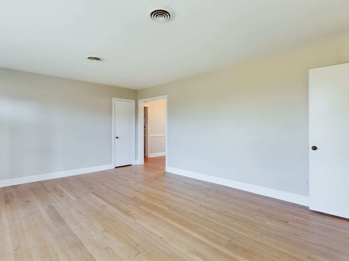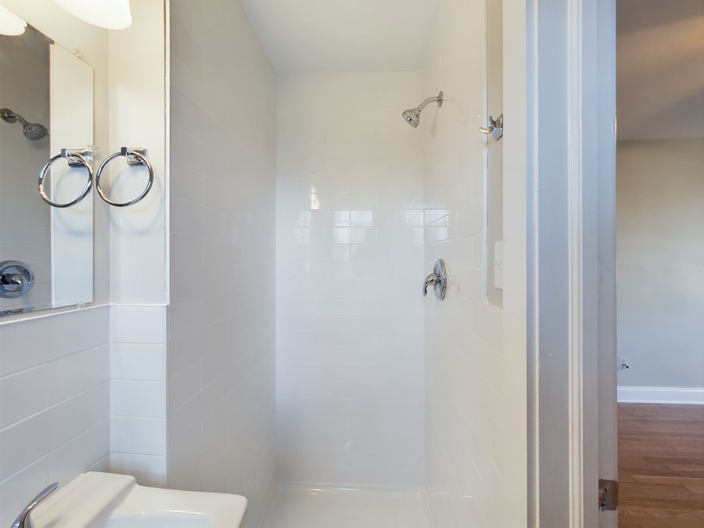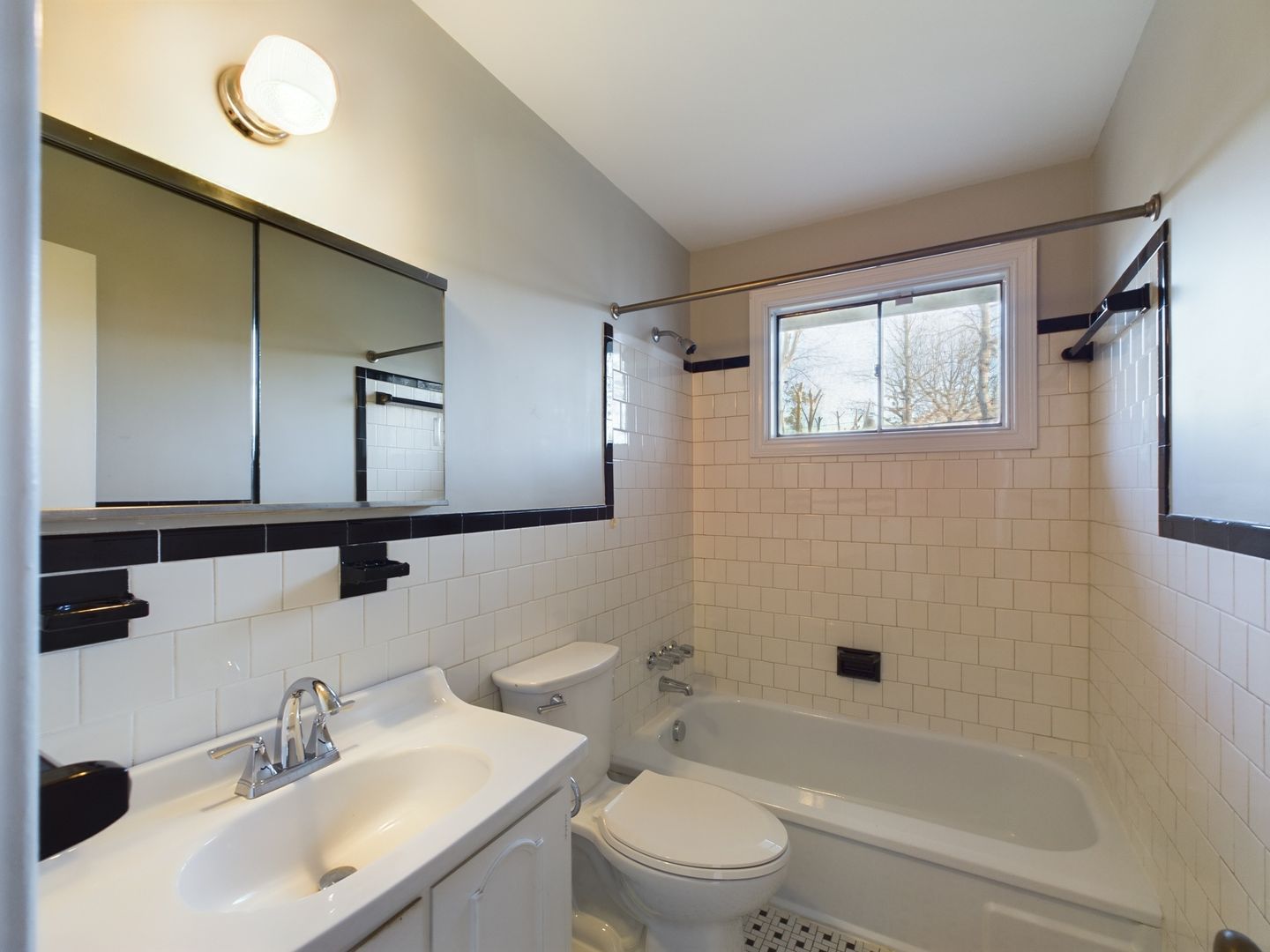 Down the hallway are three generously sized bedrooms, all featuring original hardwood floors and ample closet space. The hall bathroom serves the secondary bedrooms, while the primary bedroom includes its own private full bath with a tiled stall shower.