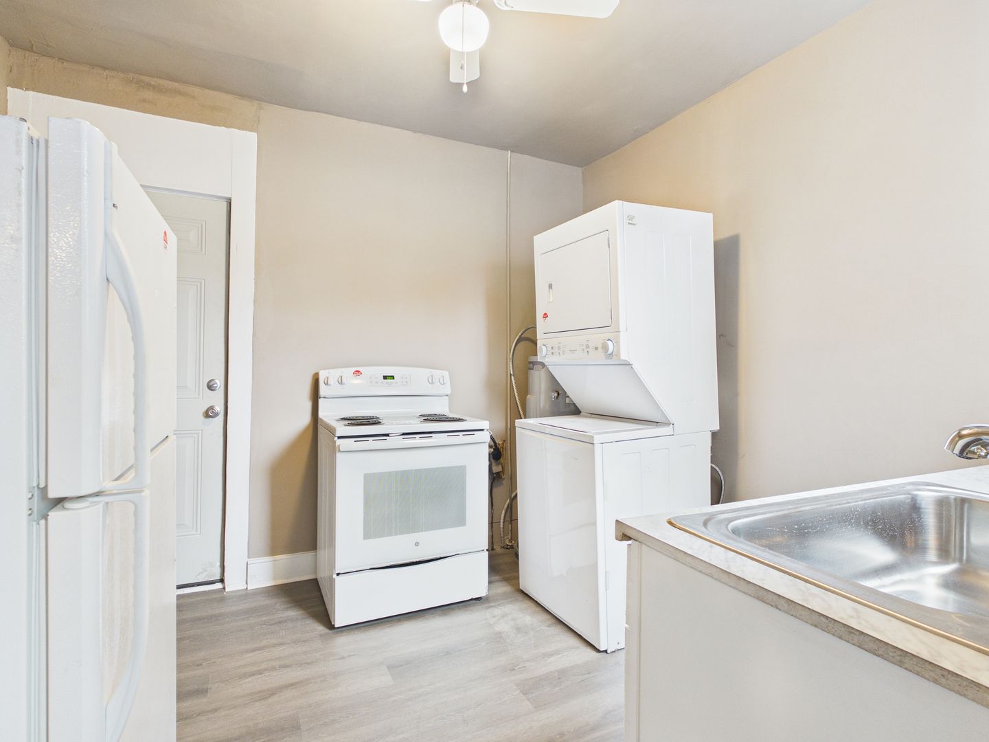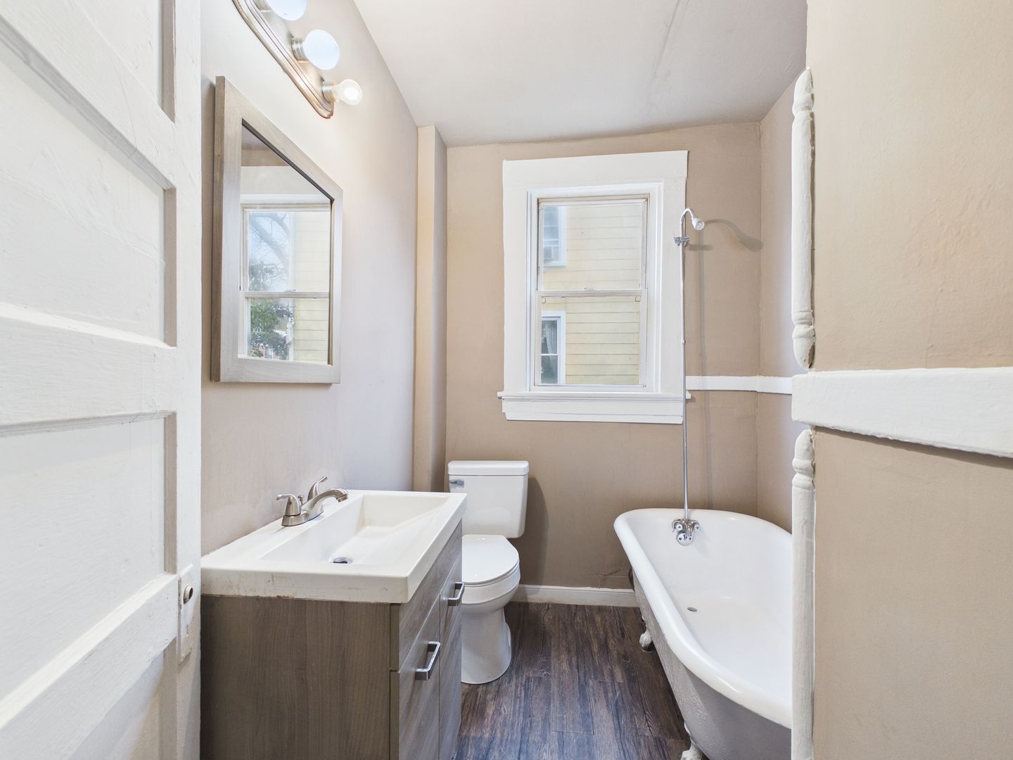 Inside, you’re welcomed into a bright bedroom and a spacious main living area that connects seamlessly to the rest of the apartment. The full bathroom features a new vanity and a charming clawfoot tub with shower. Toward the rear of the home, a versatile flex room offers the ideal space for a home office, den, or creative studio. The kitchen provides direct access to the back deck — perfect for enjoying fresh air.