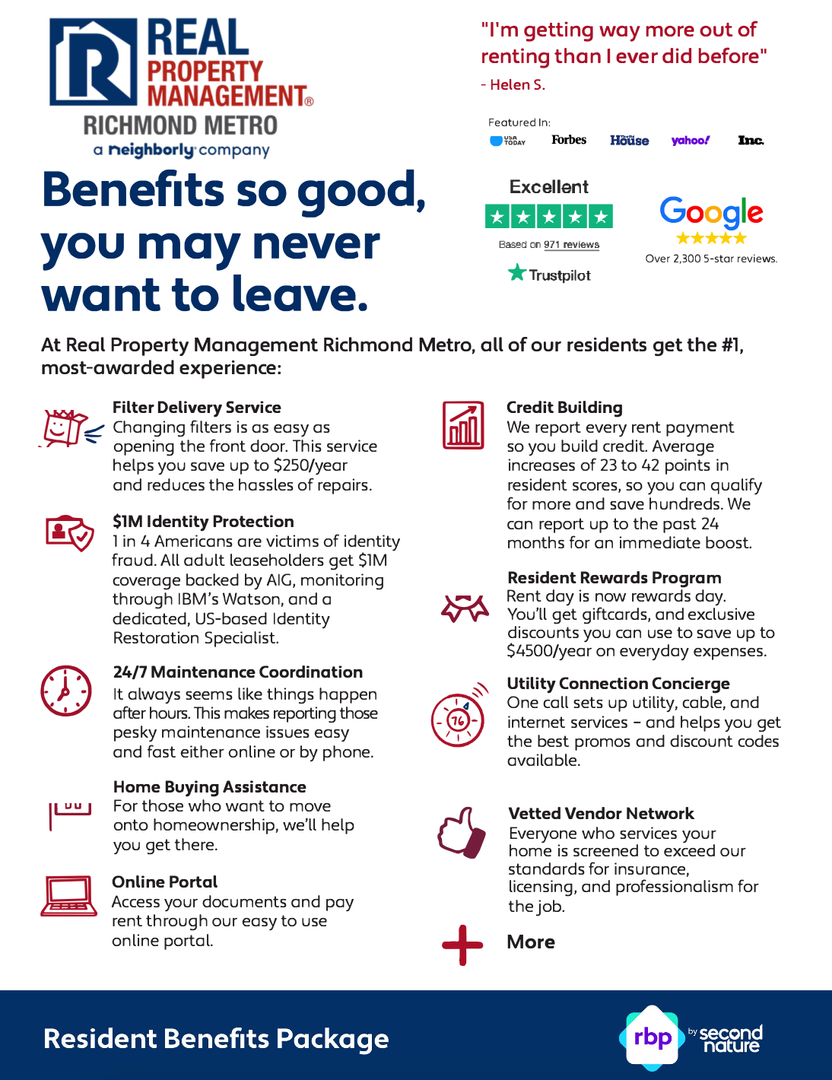 ***The Real Property Management Richmond Metro Resident Benefit Package is designed to provide convenience, professional services, and cost savings to our residents. By applying, Resident(s) agree to be automatically enrolled in the program and agrees to pay an additional $45 per month, payable with rent.