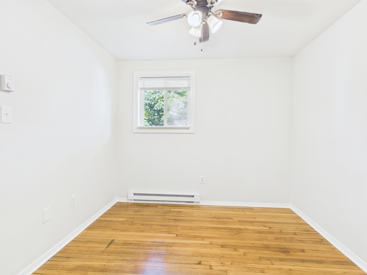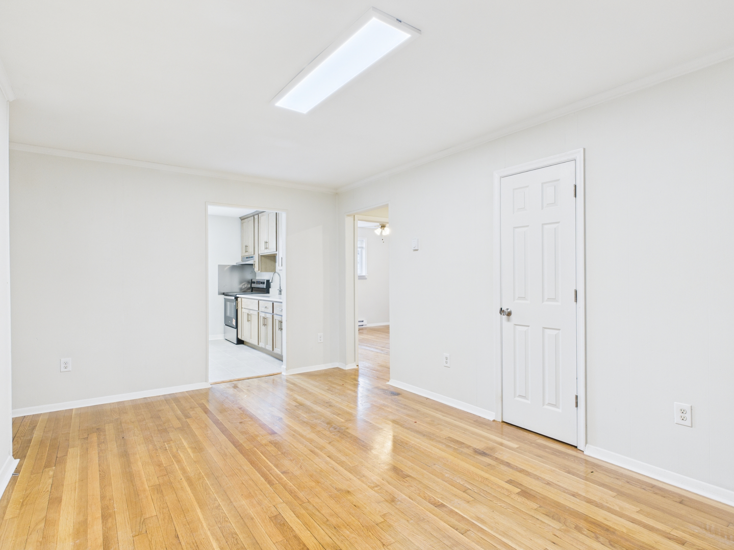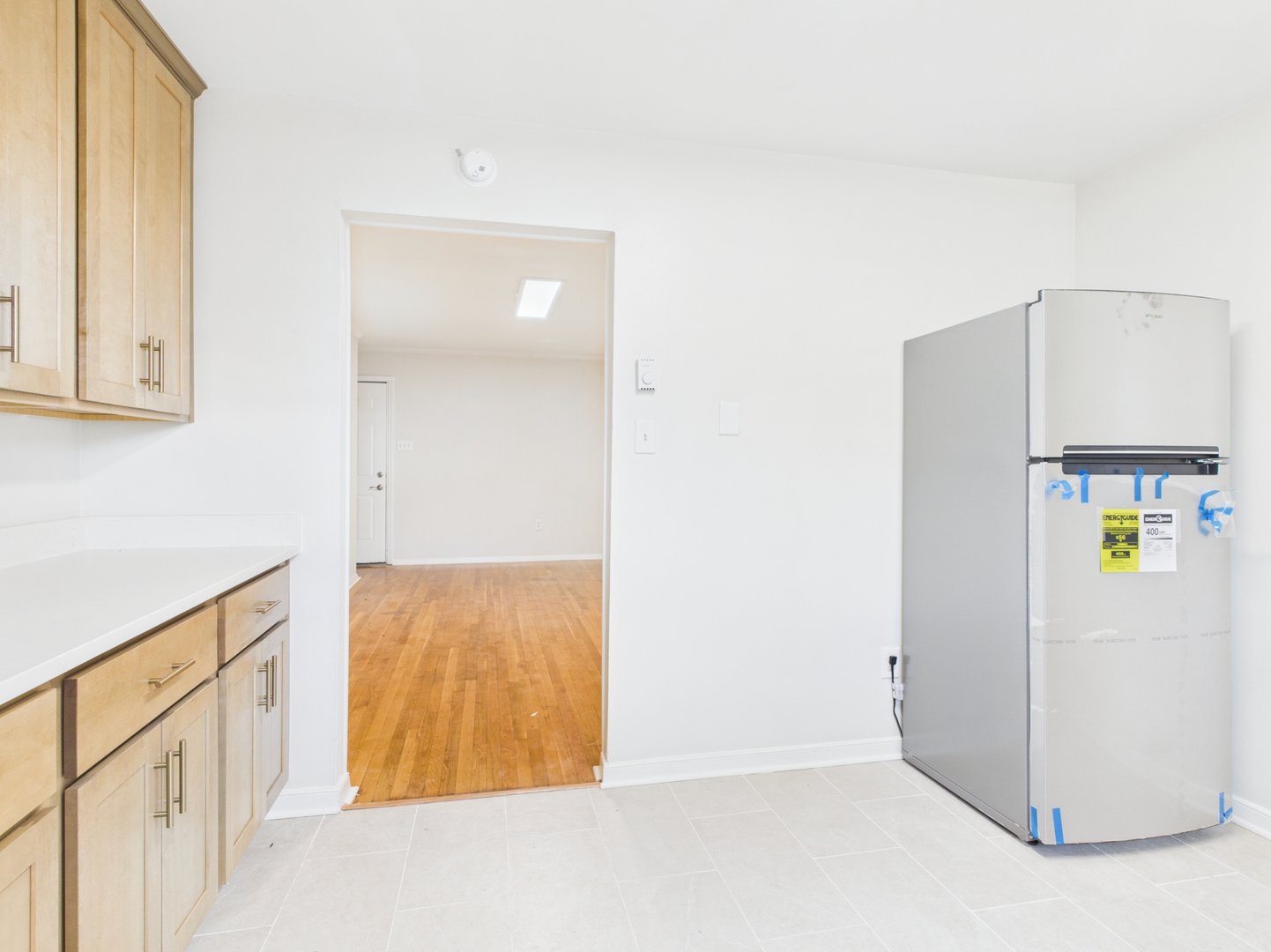 2 bedroom, 1 bath apartment, featuring hardwood floors and a modest kitchen with laminate flooring.