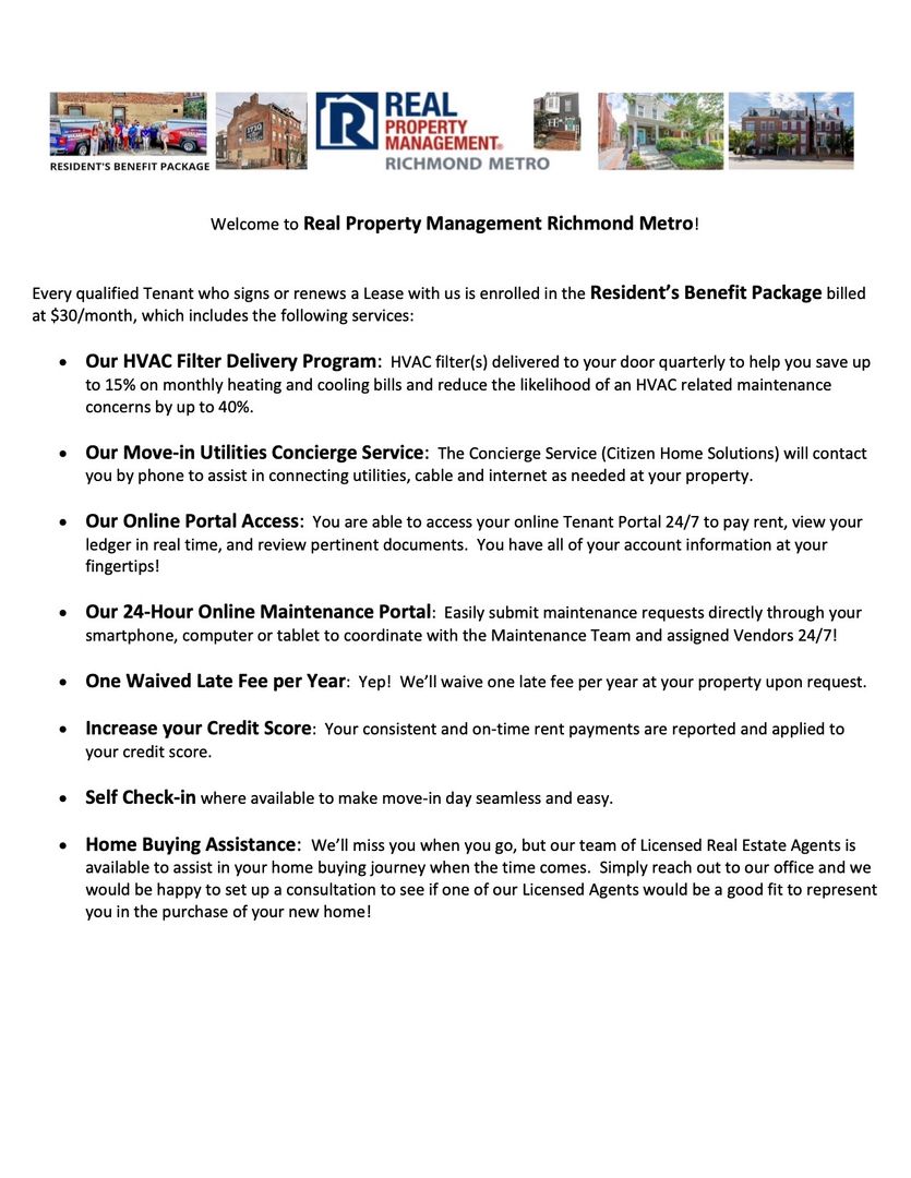 ***The Real Property Management Richmond Metro Resident Benefit Package is designed to provide convenience, professional services, and cost savings to our residents. By applying, Resident(s) agree to be automatically enrolled in the program and agrees to pay an additional $45 per month, payable with rent.